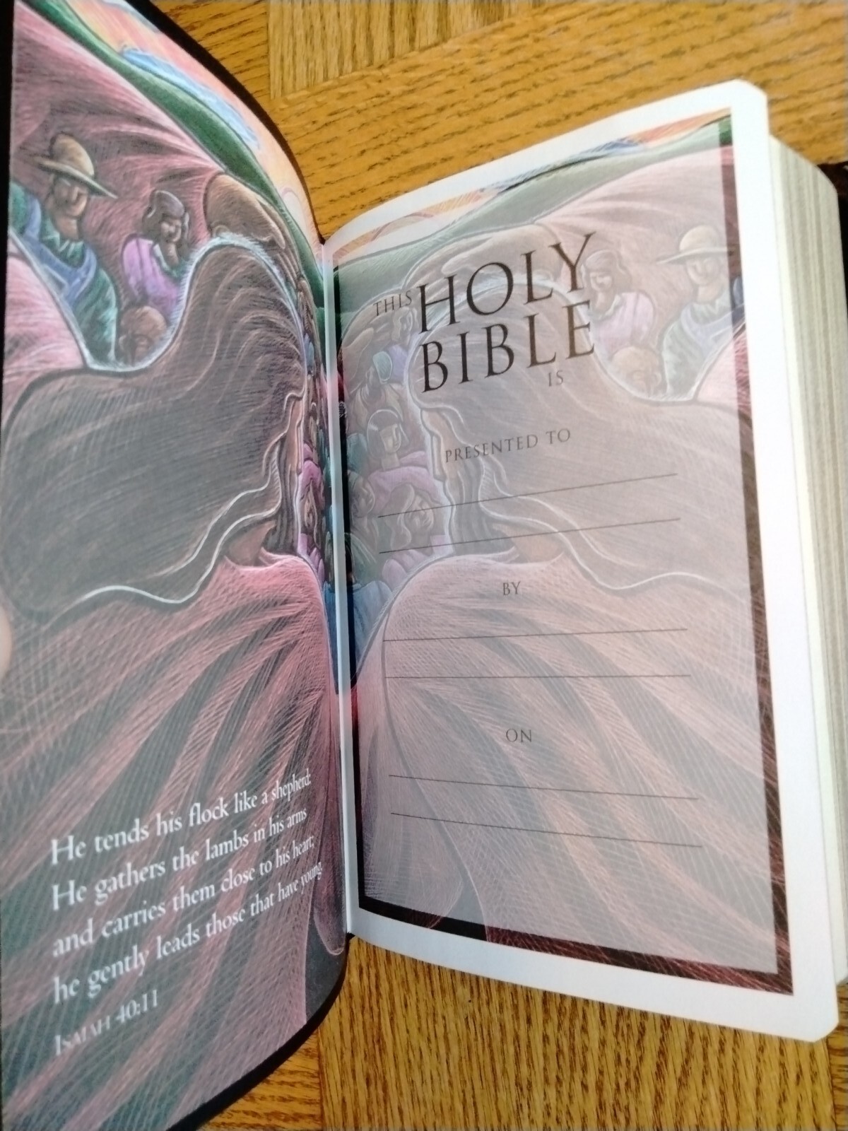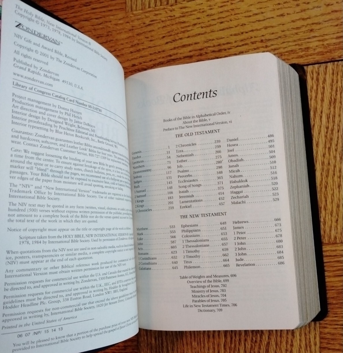Holy Bible New International Version Zondervan 2001. Very clean Bible. Looks like it was hardly used. The page that would be used to write the name of the person getting the Bible and from the person giving it has not been filed in . Preowned and in very good condition.