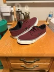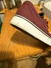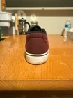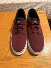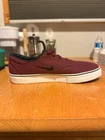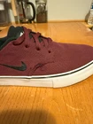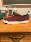 The Nike SB Clutch in size 10 is a maroon low-top canvas sneaker designed for skateboarding. It features a sleek design with a Nike SB logo and style code 729825-600. The shoe is part of the Nike SB product line, known for athletic performance and style. This is a pre-owned item and does not include the original box that came with the shoe. There is minor damage to the side of the right shoe, as well as wear on the midsole.