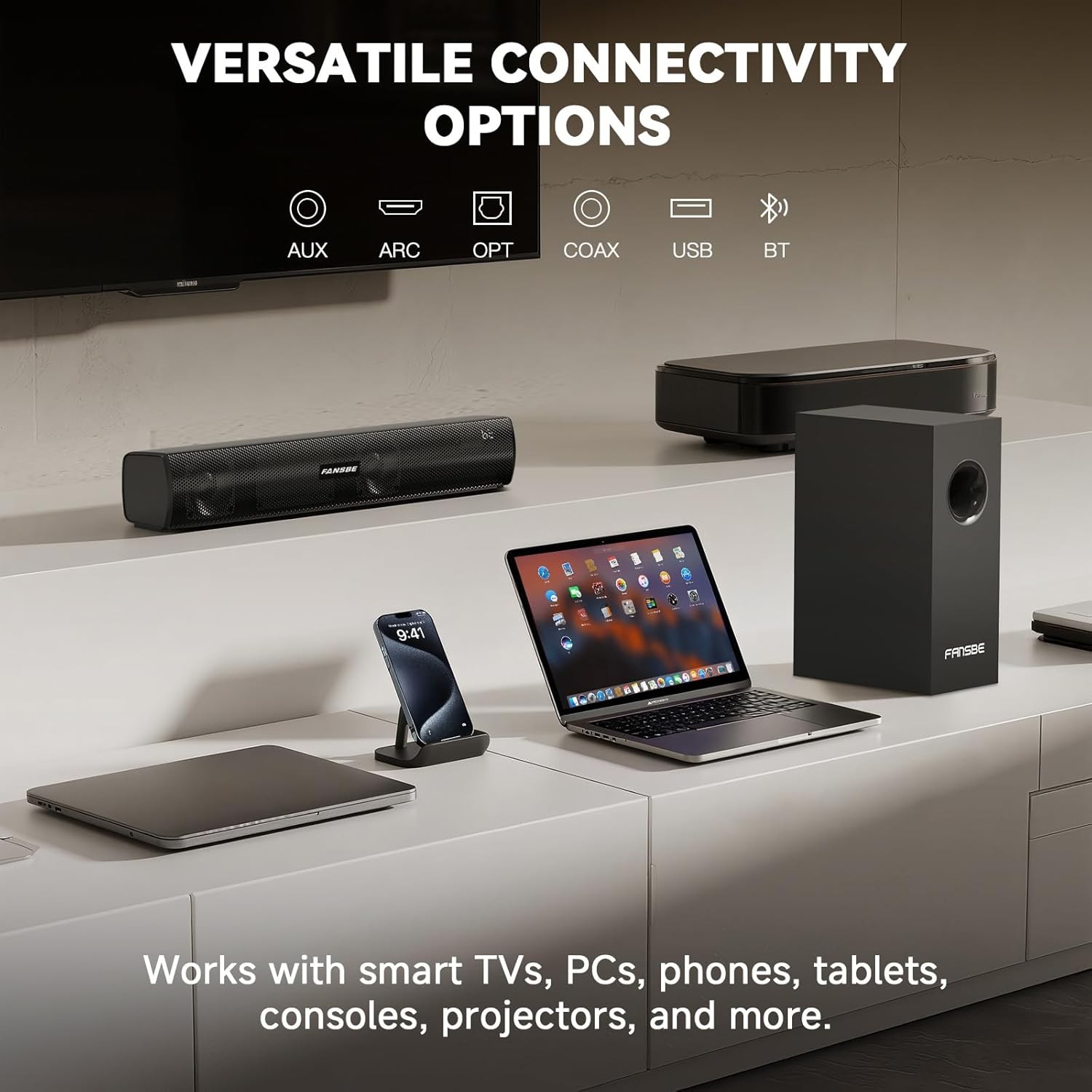 [Immersive Audio Performance] Experience rich, room-filling sound with this sound bar for smart TV, featuring two premium 2" full-range 15W speakers(total 30W for TV sound bar). The sound bar enhances vocal clarity and detail, while its compact size doesn’t compromise on power. Whether for movies or music, this TV sound bar pc speaker delivers high-quality audio that transforms your entertainment experience [Powerful Bass with Wired Subwoofer] Pair the sound bar for smart TV with the included 4" subwoofer for a deep, resonant bass response down to 55Hz. This soundbar and subwoofer combo delivers 90W of surround sound that immerses you in every scene. From action-packed movies to immersive gaming, the sound bar brings cinematic depth to your living room [Seamless Multi-Device Connectivity] Easily connect the sound bar to your TV via HDMI (ARC), AUX, optical, coaxial, or USB flash drive. The sound bar also supports Bluetooth 5.3 for wireless streaming from smartphones and tablets. The subwoofer connects directly to the sound bar for synchronized bass, and switching input modes is simple using the remote or MODE button on the sound bar [Customizable Sound Modes] The sound bar for smart TV features 3 adjustable sound modes: Music, Movie, and News. With the included remote, tailor the sound bar’s bass and treble to match your preferences. This sound bar ensures crisp dialogue, impactful lows, and detailed highs for a fully balanced listening experience [Sleek Design & Complete Accessories] With a slim 2.36" profile, this sound bar for home theater sound system fits perfectly under most TVs or can be wall-mounted without blocking the screen. The TV sound bar package includes everything you need: a subwoofer, cables (HDMI, AUX, optical), mounting kit, remote, and manual. Every sound bar is backed by a 1-year warranty and responsive support team Product description 1 Soundbar 2 Subwoofer 1 Multiple Connections 2 Wired Connection 3 Bluetooth Connection 1 Dual Mounting 2 Multi-Scene Use 1 News Mode 2 Movie Mode 3 Music Mode 1 Package Contents 2 Button Guides