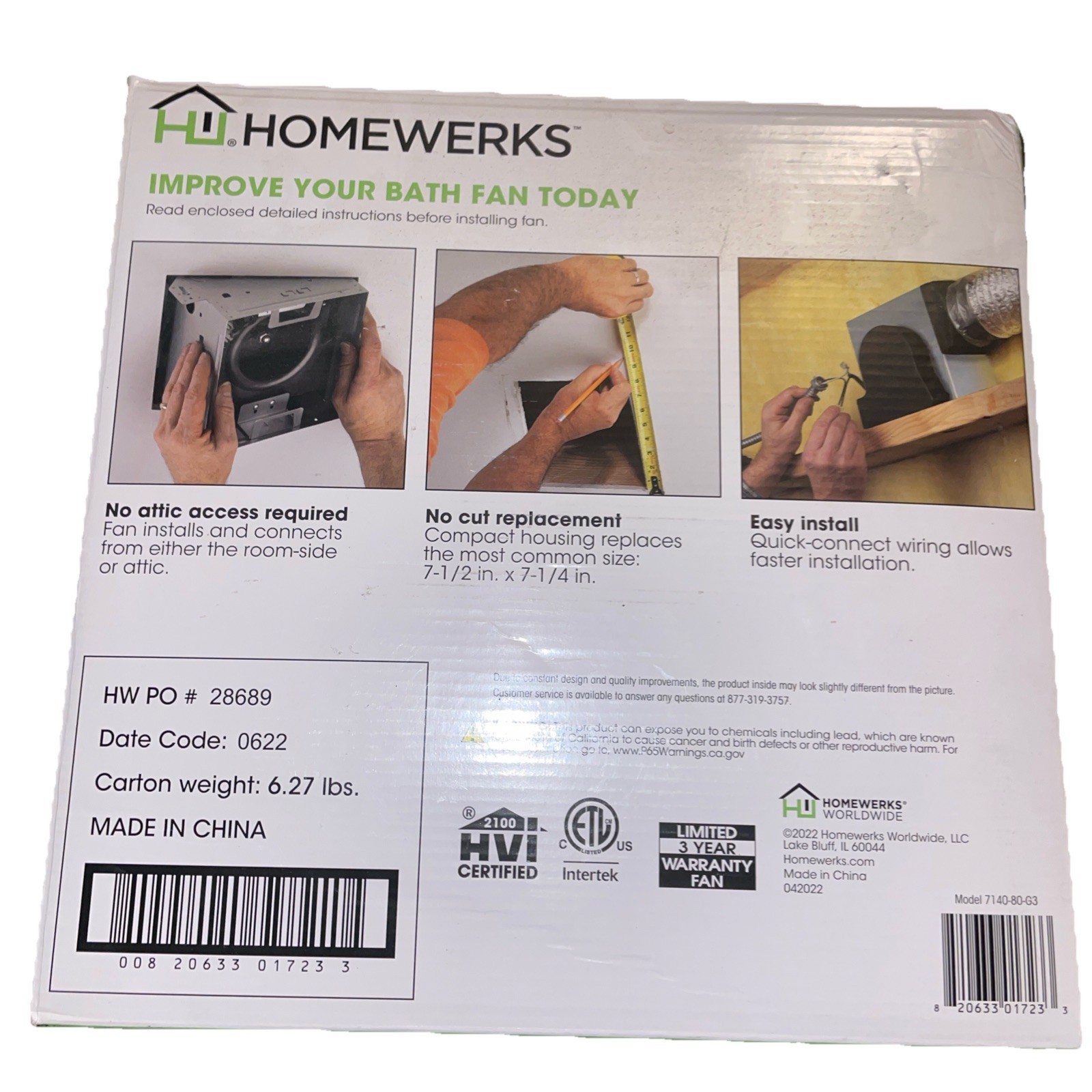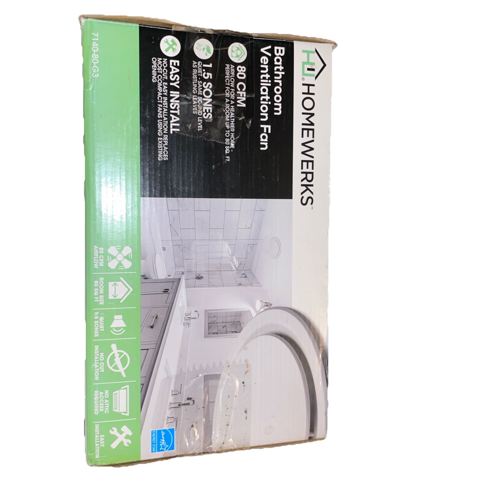 Open box. Box has been opened, but fan appears unused. Includes fan unit, screws, and paperwork. No visible missing parts, but sold as shown. Description: Homewerks bathroom ventilation fan rated at 80 CFM, ideal for bathrooms up to 80 sq ft. Quiet operation at 1.5 sones. Designed for easy installation and replacement using existing openings. Box was opened, but contents appear complete and unused. Includes fan, mounting hardware/screws, and instructions (see photos). Box may show light wear from storage. Brand: Homewerks Model: Bathroom Ventilation Fan Airflow: 80 CFM Noise Level: 1.5 Sones Installation: Ceiling mount