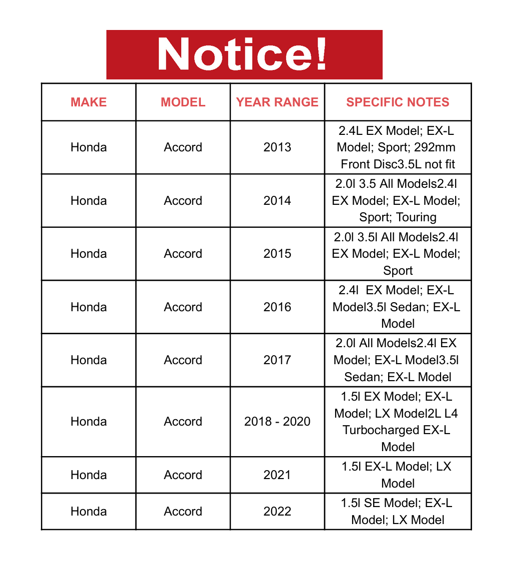 Store Categories Store Categories Air Filter Brake Pads Brake rotor Brake rotor and pads Catalytic Converter Suspension Parts Accessory Wheel Hub Other Details Front Drilled and Slotted E-Coating Black Brake Rotors & Ceramic Pads 2x Drilled & Slotted Disc Brake Rotors :45251T2FA50( 293MM ) 4x Ceramic Brake Pads :D1654 Specifications: For Both Driver & Passenger Side Cast from OE Grade Alloy Machined to OE Specs Direct Replacement Black E-Coating Feature : Paint Coating to prevent rust and corrsion for longer time More attractive Smooth surface finish requires less time for rotor “break-in" to extends pad life Fits: MAKE MODEL YEAR RANGE SPECIFIC DETAILS Honda Accord 2013 2.4L EX Model; EX-L Model; Sport; 292mm Front Disc 3.5L not fit Honda Accord 2014 2l 3.5 All Models 2.4l EX Model; EX-L Model; Sport; Touring Honda Accord 2015 2l 3.5l All Models 2.4l EX Model; EX-L Model; Sport Honda Accord 2016 2.4l EX Model; EX-L Model 3.5l Sedan; EX-L Model Honda Accord 2017 2l All Models 2.4l EX Model; EX-L Model 3.5l Sedan; EX-L Model Honda Accord 2018 - 2020 1.5l EX Model; EX-L Model; LX Model 2L L4 ELECTRIC/GAS 2L L4 Turbocharged EX-L Model Terms of sales Shipping Policy Payment Method Returns Policy Terms of sales • Please leave us a good rating after you have received the item and are happy with our transaction. If there are any issues, please contact me first before leaving a neutral, negative or 5 star rating. Customer Satisfaction is our top priority!! We promise we can make you happy if you give us a fair chance. Thanks and happy bidding! • Anyway, if you have any troubles,please feel free to contact us.We're willing to do anything resonable to help you out.Please do not leave any negative or neutral feedback before letting us know. Thanks! Shipping Policy • Items are usually shipped out within 24 hours during the business days after payment has been received. (except Saturday and Sunday).Delivery Time is about 4-7 business days to most of regions. We are not responsible for any wrong or undeliverable addresses. Please verify and update your shipping address on eBay during checkout. Payment Method • PayPal Preferred, Credit or debit card through PayPal. Returns Policy • All returned products (Replacements or Refund) need to be assigned an RMA # (Return Merchandise Authorization #) prior to return. Please contact us through eBay's messaging system to obtain an RMA# for the return. Any returned product without an RMA # on package will not be accepted or processed. Warranty Warranty • All of our brand new items come with a 30-60 Days money-back guarantee. We define the item as defective only if it doesn't function as described. • It is the buyer's responsibility to understand the item description before bidding. We will replace the defective items, provided that they are in stock within the warranty period posted with the listing. We will refund the purchase price if the replacement is not available or buyer prefers a refund and send the original item back at his/her own cost. • The guarantee will be only for the cost of the item, we will not responsible for installation or other fees like labor expenses, towing expenses, additional repair expenses or other related expenses. About us About us • We have developed long-term relationships with world-renowned suppliers to ensure our products meet the highest industry standards. Whether it's wheel Hub, drivetrain or brake components, we offer a wide range of product lines to suit a variety of makes and models. Whether you are a garage, a car owner or a car enthusiast, we offer personalised advice based on your needs to ensure you choose the most appropriate parts. Copyright©2023 One-topauto20 Store Categories Store Categories Air Filter Brake Pads Brake rotor Brake rotor and pads Catalytic Converter Suspension Parts Accessory Wheel Hub Other Details Front Drilled Brakes Rotors and Pads Kit for Honda Accord 2013-2020 Brake Rotor Front Drilled and Slotted E-Coating Black Brake Rotors & Ceramic Pads 2x Drilled & Slotted Disc Brake Rotors :45251T2FA50( 293MM ) 4x Ceramic Brake Pads :D1654 Specifications: For Both Driver & Passenger Side Cast from OE Grade Alloy Machined to OE Specs Direct Replacement Black E-Coating Feature : Paint Coating to prevent rust and corrsion for longer time More attractive Smooth surface finish requires less time for rotor “break-in" to extends pad life Fits: MAKE MODEL YEAR RANGE SPECIFIC DETAILS Honda Accord 2013 2.4L EX Model; EX-L Model; Sport; 292mm Front Disc 3.5L not fit Honda Accord 2014 2l 3.5 All Models 2.4l EX Model; EX-L Model; Sport; Touring Honda Accord 2015 2l 3.5l All Models 2.4l EX Model; EX-L Model; Sport Honda Accord 2016 2.4l EX Model; EX-L Model 3.5l Sedan; EX-L Model Honda Accord 2017 2l All Models 2.4l EX Model; EX-L Model 3.5l Sedan; EX-L Model Honda Accord 2018 - 2020 1.5l EX Model; EX-L Model; LX Model 2L L4 ELECTRIC/GAS 2L L4 Turbocharged EX-L Model 1. OEM-Perfect Fit with Advanced Cooling Technology Maximize safety and performance with direct-fit brake rotors engineered to exact OE specifications for seamless installation. Our drilled and slotted rotors utilize precision-cooling vanes and rounded slots to dissipate heat 30% faster, preventing warping, brake fade, and dangerous hot spots. Paired with ceramic brake pads, this combo delivers quieter stops, 95% less dust, and OEM-level durability—ideal for daily drivers and performance vehicles alike. 2. Rust-Proof Defense & Long-Lasting Performance Say goodbye to corrosion! Black E-coating rotors feature an electrophoretic finish that bonds to every surface, blocking moisture and road salt for 10X longer rust resistance. The high-strength alloy core resists wear, while chamfered ceramic pads with noise-canceling shims eliminate squeals and vibrations. Perfect for snowy climates or coastal areas—protect your brakes and maintain a sleek OE appearance for years. 3. Silent Stops, Zero Hassle Installation Upgrade with confidence!