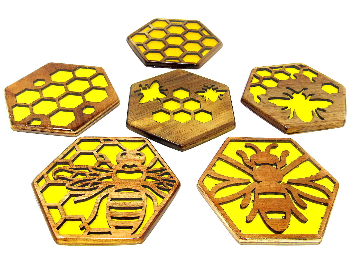 6 Honey Bee Resin & Wood Coasters, Honeycomb, Wooden, Epoxy, Resin, Drink Coasters , Barware, US Seller. Condition - New in original box. Color - Wood & Resin Size - 3 3/4" across. Ruler is not included You will receive the actual item pictured & described All our packages ship with tracking Stored in & Ships from our free - pet free home. If there is a problem please contact us we try to respond within a few hours. Thank you for visiting, please visit us again, real soon. HerbsCraftsGifts 10.3 oz =15 home garden