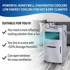 Honeywell 470-659CFM Portable Evaporative Cooler, Ice Compartment, CL201AE Item shows signs of use, see photos, it is in working order and has been tested. Will not include remote or ice packs. Like a breeze flowing across a lake, Honeywell Evaporative Coolers provide a natural, cool breeze with the power of water evaporation. Honeywell Evaporative Coolers combine 3 appliances: Evaporative air cooler, fan and humidifier - into one compact energy-saving system. A fan alone creates a breeze by recirculating warm air, but when you add water and/ice to the tank, Honeywell Evaporative Coolers reduce the temperature of incoming warm air, transforming it into a cool moist breeze. Honeywell Portable Air Coolers are built to last and carefully crafted with the science of aerodynamics to minimize energy consumption while maximizing the airflow. An evaporative air cooler offers an energy efficient cooling option when the air is hot with low humidity, such as desert areas like the southwestern United States (recommended humidity level is 60% or less for maximum efficiency). For those living in more humid cities, please consider Honeywell Portable Air Conditioners. Features Indoor evaporative air cooler or swamp cooler ideal for use in the southwest and Midwest regions of the US - Performs best in hot/dry climates where humidity levels are <60% Super low power consumption 230W & powerful 470-659CFM airflow ideal for spot cooling small to medium spaces such as living room, bedroom, den, covered patio, garage Carbon Dust Air Filter, Remote Control, Low water alarm, energy saving timer, Adjustable humidification dial & Ice compartment. Moist, cool breeze can cool you down & be used as humidification during winter months. NOT an Air Conditioner & NOT just a Fan – Environmentally friendly Evaporative Cooler reduces temperature through water evaporation. Mimic the comfort of a cool lake breeze in your home Details Product Dimensions: 14.6 x 18.9 x 32.9 inches Item Weight: 23.4 pounds Shipping Weight: 28.5 pounds Manufacturer: Honeywell Item color: Silver Item MPN: CL201AE Item part number: CL201AE Fast Shipping We get your order shipped out within 3-business days and delivered to your doorstep as quickly as possible. Competitive Pricing With our dynamic pricing model, our prices are always competitive. Our prices are usually the lowest that you will find on the internet. Rest assured that you're getting a good deal when purchasing with us. 30-day Money Back Guaranty We are committed to making sure that you leave this transaction satisfied. If you're unhappy with the product for any reason, you may return it back for your money-back or a replacement within 30 days. No questions asked!