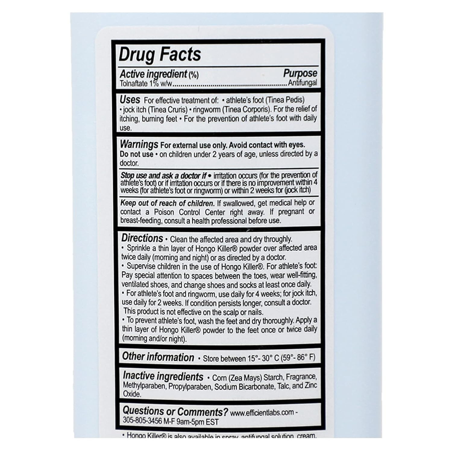 Store New Arrivals Add to Favorite View Feedback Contact Hongo Killer Antifungal Powder - Athlete'S Foot Treatment Description Unit Count 7.05 ounce Number of Items 1 Item Form Cream,Powder Product Dimensions 2.25 x 2.5 x 6.35 inches; 7.04 ounces Is Discontinued By Manufacturer No Scent Agave Brand HONGO KILLER Manufacturer Efficient Laboratories, Inc. Antifungal Powder is easy to apply! Just sprinkle it on clean and dry feet! Hongo Killer Powder Talc will help you to eliminate the athlete's foot. It assists you in remove jock itch, absorbs moisture, and controls foot odor. By eliminating the fungi with Hongo Killer, you will also destroy the terrible feet smell. Athlete's Foot Antifungal Cream is ideal for a night to moisturize affected areas while eliminating the infection. Do not wait more and start using our improved formula with a refreshing and soothing scent. Start showing beautiful feet free of a fungus with Hongo Killer! This Hongo Killer Antifungal Powder is ideal for relieving cracking and discomfort associated with an athlete's foot and ringworm. Our formula provides relief from itching, cracking, burning, flaking, and the athlete's foot symptoms while absorbing moisture and controlling odor with its cool, soothing scent. Ideal for use during the day instead of baby powder, this product can prevent athlete's foot and is perfect for keeping your feet or jock area dry during the day. In addition to the talc powder, we recommend using Hongo Killer Cream. ABOUT US We offer the best prices around on high quality products. Our E-store includes media such as books, movies, music and games while offering electronics, toys, sporting apparel, clothing, tools, general home, garden items and more. SHIPPING We are always working hard to ensure your package arrives as soon as possible. Please understand that some factors like weather, high postal traffic, and the performance of shipping companies are outside of our control. We offer free shipping to the lower 48 states and ship within 2 business days of payment, usually sooner. We do not accept P.O. Boxes. Please provide a physical address. RETURNS We offer a 30-Day Return Policy on items which you are not completely satisfied with. You have the option for a full-refund or an exchange of the item. No returns are available on items shipped outside of the USA. PAYMENT We accept PayPal. CONTACT US This page content is yet to come Please ad us to your favorite seller and visit again later Thank You CUSTOMER SATISFACTION We try our very best to make sure every customer is completely satisfied. If there's a problem, message us! We're happy to help.