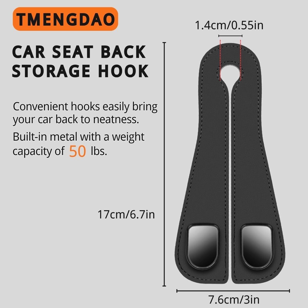 About this item Practical Purse Hanger for Car: These car bag hooks are designed to be practical and convenient, helping you keep your car neat and organized. They are perfect for hanging groceries, handbags, umbrellas, and other items, preventing them from rolling around on the car seats or floor. Their streamlined design ensures they blend perfectly with your car's interior. High-Quality Material: These car seat storage hooks are made of high-quality leather, making them very durable and wear-resistant. The metal double hooks provide greater weight capacity, allowing you to store more items. Fine workmanship ensures a smooth surface that won't damage your belongings, and the stylish appearance makes them a great choice for your car. Dual Storage Space: The dual hook design not only increases storage space but also allows you to place your cell phone on it to watch videos, freeing your hands. Easy to Install and Use: The car purse holder can be rotated 360 degrees and can be used both front and back. These bag holders for cars are very flexible and can be bent to fit most car seats, ensuring compatibility and ease of use. Dimensions: 1 x 3 x 6.7 inches.