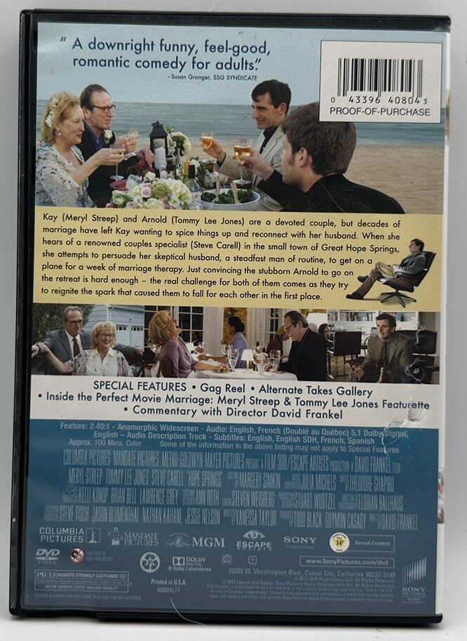 This DVD features the 2012 comedy film "Hope Springs" starring Meryl Streep, Tommy Lee Jones, and Steve Carell. It is a standard edition DVD with a widescreen format and a run time of 100 minutes. The movie is rated PG-13 and has English, French, and Spanish subtitles available. The DVD is region code 1 (US, Canada...) and features the directors cut of the film. It is a great addition to any movie collection and perfect for fans of the genre. The DVD comes in a tall/DVD case and is produced by Ernst Lubitsch, Guymon Casady, and Todd Black. Get your copy today and enjoy the cult classic comedy video.