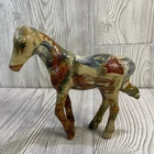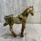 For sale is this beautiful, colorful set of 2 Horse figurines. Mare is 10" tall, foal is 7½" tall. Colorful Autumn Fall Horse Equine themed all-over print on both. Mare is approximately 12" long for comparison. Mare is in good condition, minor wear consistent with age, use. Foal has been repaired; cracks on it's right front and rear legs. See photos.