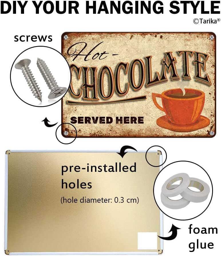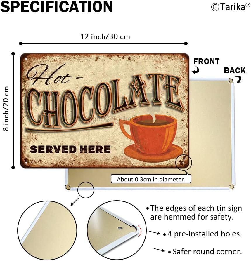 Product Description ABOUT THIS SIGN Material: Tin/Metal Color: As pictures shown Size: 20 x 30 cm/ 8 x 12 inches Thickness: 0.25 cm Note: Manual measurement, please allow slight errors in size. APPLICABLE PLACES Indoor & Outdoor: This decorative wall sign has a wide application, suitable for indoor or outdoor use, such as cafe, bar, coffee corner...You can hang it on the door, window, wall or more places, easily adding nice decoration effects. PREMIUM CHOICE Printing Art: This decorative tin painting adopts high-definition inkjet technology, waterproof and drought-resistant, durable, and can be used indoors and outdoors. Safe and Easy to Operate: The edges of each tin sign are hemmed for safety. The four corners of the product have pre-installation holes for easy hanging. You can hang it with screws, cable ties, foam glue, etc.