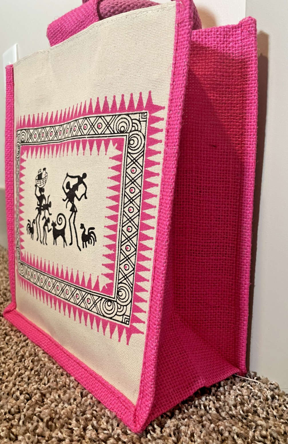 Unleash your vibrant side with this hot pink canvas tote, a playful addition to your accessory collection. Designed with a bold pattern featuring people, this medium-sized bag measures 11 inches in height, 10 inches in width, and 5 inches in depth, providing ample space for your essentials. The double handle design ensures comfort and convenience for effortless carrying. Crafted in India, this tote boasts a secure zip closure to keep your items safe, while the unlined interior maintains a lightweight feel. The exterior's durable canvas material stands up to daily use, complemented by a lively hot pink color that makes a statement with every outfit. Whether you're running errands or enjoying a day out, this tote is a versatile companion for the stylish woman on the go.
