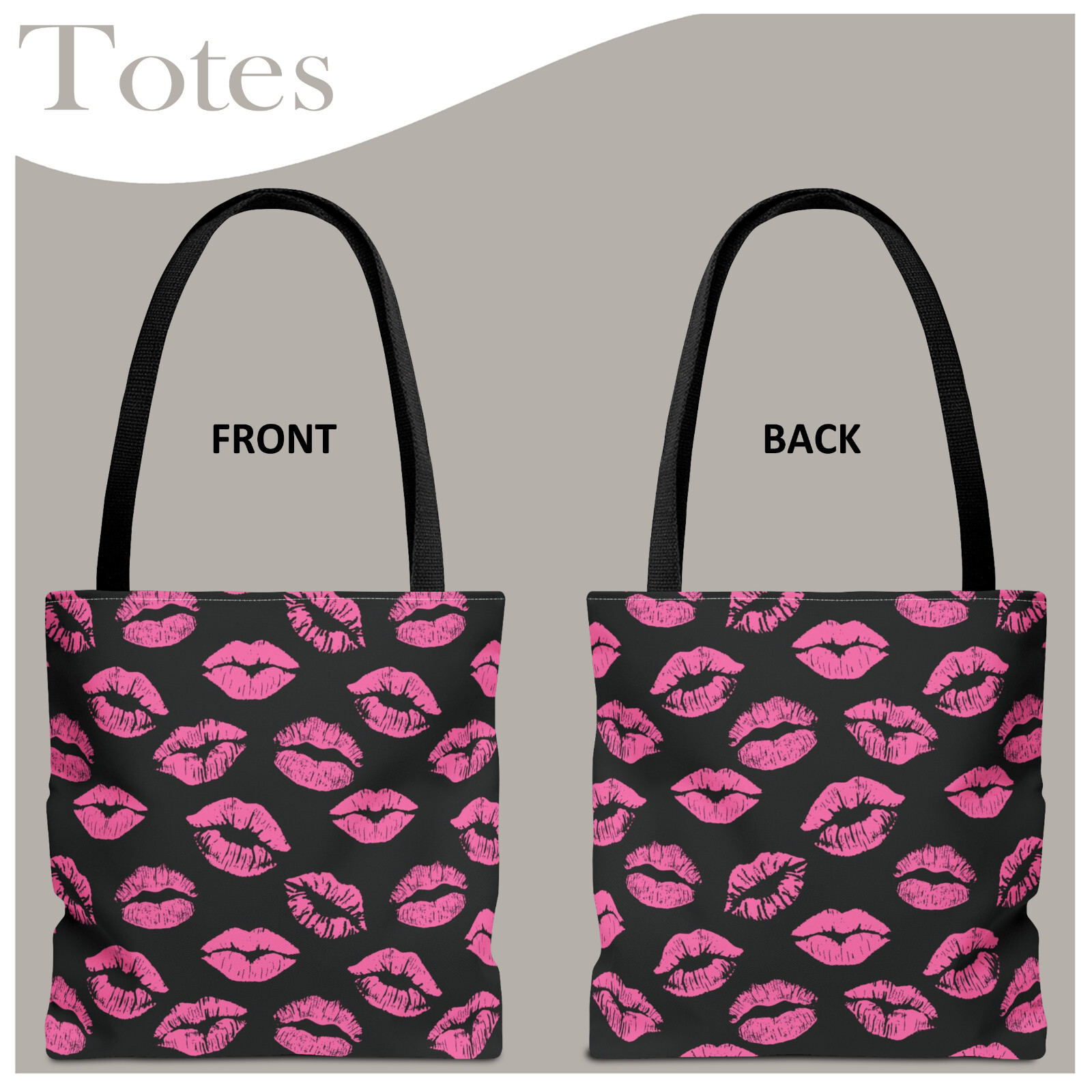 Make a bold statement with this Hot Pink Lips Tote Bag , featuring an all-over pattern of vibrant pink lipstick kisses on a sleek black background. Designed with sturdy black handles, this tote is both stylish and functional—perfect for shopping, travel, or everyday use. Made from high-quality, durable materials, it’s a great gift for her , whether for Valentine’s Day, an anniversary, or just to show off your flirty, fun side. Available in three sizes to suit your needs. Keywords : hot pink lips tote, lipstick kiss tote, kiss print tote bag, trendy tote for women, stylish black tote, aesthetic fashion bag, cute tote for her, flirty chic tote, bold fashion tote, everyday shopping bag, pink and black tote, romantic gift tote, feminine stylish tote PRODUCT DESCRIPTION: • Assembled in the USA • 100% Polyester • Boxed corners - Front and back sides are sewn together by creating extra space on the sides, adding more room • Cotton handles with reinforced stitching • With non-woven laminate inside • Black inner stitching • Transparent thread on hems. CARE INSTRUCTIONS: Remove all items from the bag before cleaning. Suggested to pretreat visible stains with stain remover. Mix warm water with laundry detergent and clean the bag with terry washcloth or a soft bristle brush. Let the bag air dry. **************** WHEN WILL I GET MY ORDER? Please check the delivery estimate on each item listing. Everything in my store is made to order. This means that the item is custom made just for you very shortly after you place your order. I do not sell any in-stock, “ready to ship” products. I cannot rush an order or promise delivery by a specific date. Please check delivery estimate & allow enough time to get your order when needed. COLORS / SIZING / CUSTOMIZATION: Actual colors may vary slightly. Every computer monitor displays colors slightly differently. I make every effort to display colors as accurately as possible. A size chart is included on each listing, if applicable. If you are between sizes, follow the guidance on the size chart. Sizes & styles are standardized. I cannot customize the sizing, style, cut, length, etc. SHIPPING / CUSTOMS CHARGES / IMPORT TAXES Carefully check your shipping address. If your shipping address is incorrect, you are responsible for the cost of reshipment (when/if the item is returned to the seller by the postal service.) Buyer is responsible for Customs Charges and Import Taxes required by your country. CANCELLATIONS / RETURNS / EXCHANGES / DAMAGED ITEMS Orders can ONLY be cancelled within 1 hour of purchase. Once an order goes into production, it is being made for you and the order cannot be canceled. ALL SALES ARE FINAL. I do not accept returns or exchanges. Because your item is made to order, I have assumed all the production costs. As an artisan, it is not feasible for my small business to accept returns like the “Big Box” stores that do millions in sales to offset their losses. If you receive a damaged or defective item or the wrong item, please contact me right away. I will work with you to make it right. THANK YOU FOR YOUR PURCHASE! I APPRECIATE YOU!!