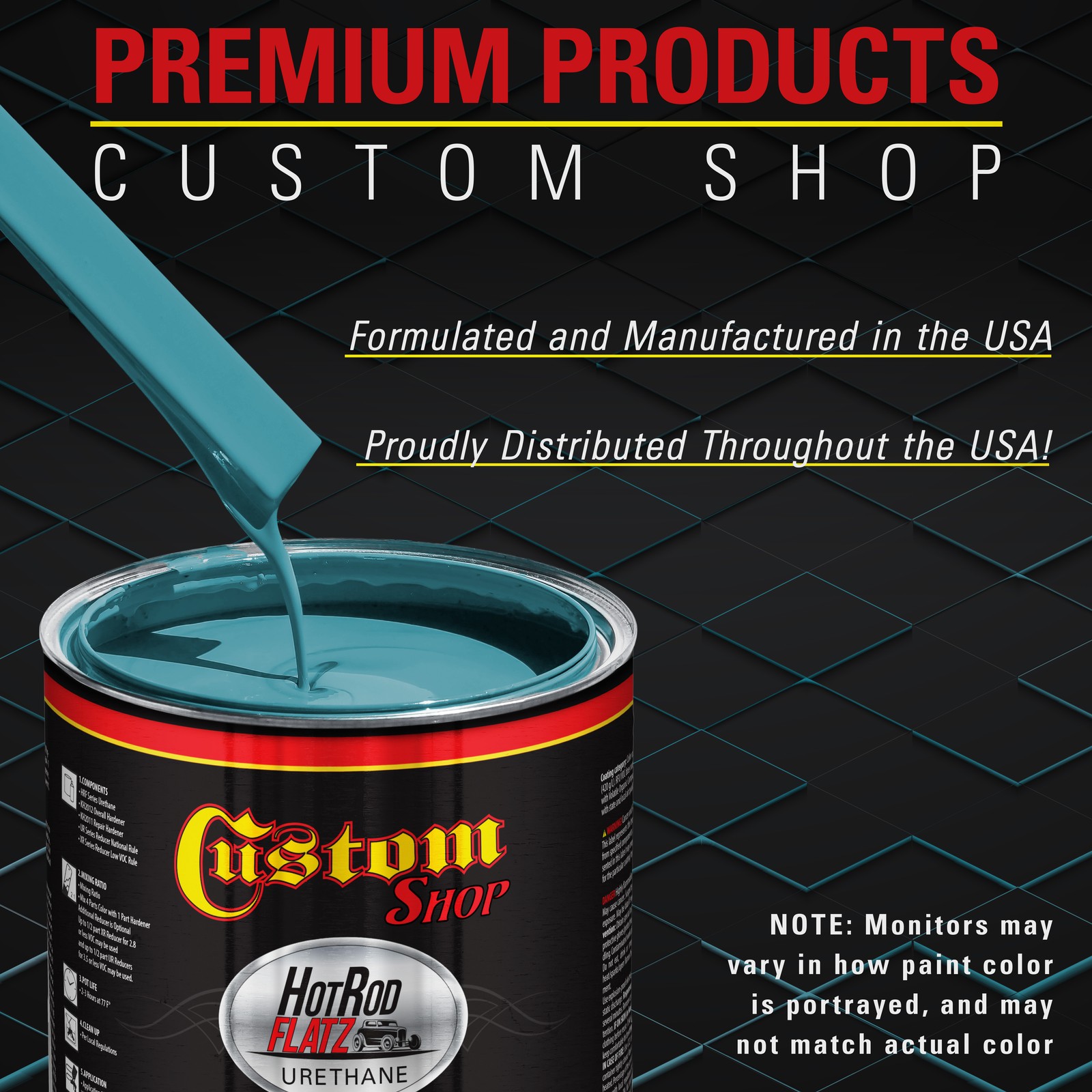 TCP Global Ebay Storefront Ordering | Shipping | Returns | International Product Information FLAMMABLE/HAZARDOUS ITEMS ARE SHIPPED VIA UPS GROUND/STANDARD TO THE LOWER 48 U.S. STATES & CANADA. ***SHIPPING VIA U.S. POSTAL SERVICE OR TO A P.O. BOX IS NOT AVAILABLE.*** RUSH AIR SHIPPING IS AVAILABLE IN CONTINENTAL U.S. FOR AN ADDITIONAL HAZMAT AIR SHIPPING CHARGE. CONTACT US PRIOR TO ORDERING FOR AIR SHIPPING QUOTE. IF ORDER IS PLACE FOR AIR SHIPPING YOU WILL BE CONTACTED FOR ADDITIONAL SHIPPING PAYMENT. INTERNATIONAL SHIPPING IS AVAILABLE. CONTACT US FOR SHIPPING QUOTE PRIOR TO ORDERING. Part# KUS KIT-HRF1502-M-GL Medium Blue - Hot Rod Flatz Flat Matte Satin Urethane Auto Paint - Complete Gallon Paint Kit - Professional Low Sheen Automotive, Car Truck Coating, 4:1 Mix Ratio Complete 1 Gallon Custom Shop Hot Rod Flatz Acrylic Urethane Auto Paint Kit. The kit provides 5 quarts (1 gallon + 1 quart) of sprayable material. It has a 4 to 1 mix ratio and is 2.8 VOC when used as packaged, as no reducer is required (optional XR & UR series reducers sold separately). Paint Kit includes 1 Gallon of Hot Rod Flatz Single Stage Acrylic Urethane Paint Color, 1 Quart of Custom Shop Urethane Hardener (KH2012-QT), 5 Pack of 190 Micron Nylon Automotive Strainers, and a 5 Pack of Wood Paint Mixing Sticks. Hot Rod Flatz Acrylic Urethane System is a high-performance professional, easy-to-use single-stage paint coating system designed for overall automotive refinishing. No clearcoat is required or recommended. Pre-flattened ready to spray low-gloss color with a consistent satin sheen with the desired 30-degree satin primer appearance. A very durable, chemical, and solvent-resistant coating that also resists chipping and cracking and contains UV inhibitors to protect your finish from fading and chalking like traditional primers. Custom Shop Products are Made in the U.S.A., and we formulate, manufacture, and distribute our products throughout the USA. Our superior coating products only use the highest quality ingredients, which allows our customers to achieve consistent, high-quality professional results on all their painting projects! Complete Sprayable Gallon Kit Complete 1 Gallon Custom Shop Hot Rod Flatz Acrylic Urethane Auto Paint Kit. The kit provides 5 quarts (1 gallon + 1 quart) of sprayable material. It has a 4 to 1 mix ratio and is 2.8 VOC when used as packaged, as no reducer is required (optional XR & UR series reducers sold separately). Paint Kit includes 1 Gallon of Hot Rod Flatz Single Stage Acrylic Urethane Paint Color, 1 Quart of Custom Shop Urethane Hardener (KH2012-QT), 5 Pack of 190 Micron Nylon Automotive Strainers, and a 5 Pack of Wood Paint Mixing Sticks. Hot Rod Flatz Acrylic Urethane System is a high-performance professional, easy-to-use single-stage paint coating system designed for overall automotive refinishing. No clearcoat is required or recommended. Pre-flattened ready to spray low-gloss color with a consistent satin sheen with the desired 30-degree satin primer appearance. A very durable, chemical, and solvent-resistant coating that also resists chipping and cracking and contains UV inhibitors to protect your finish from fading and chalking like traditional primers. Custom Shop Products are Made in the U.S.A., and we formulate, manufacture, and distribute our products throughout the USA. Our superior coating products only use the highest quality ingredients, which allows our customers to achieve consistent, high-quality professional results on all their painting projects! View all categories Warehouse Locations Las Vegas, Nevada South Carolina