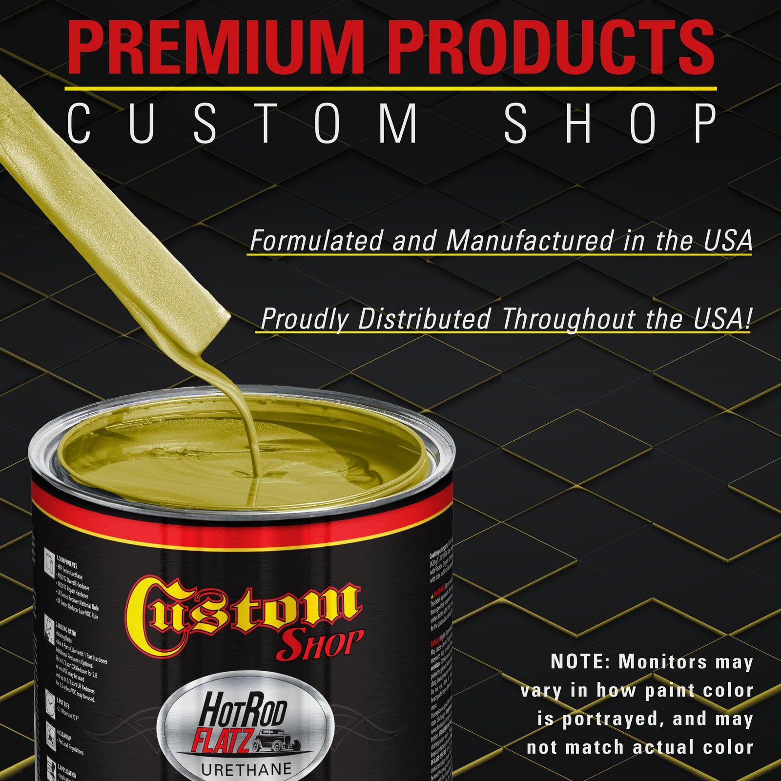 TCP Global Ebay Storefront Ordering | Shipping | Returns | International Product Information FLAMMABLE/HAZARDOUS ITEMS ARE SHIPPED VIA UPS GROUND/STANDARD TO THE LOWER 48 U.S. STATES & CANADA. ***SHIPPING VIA U.S. POSTAL SERVICE OR TO A P.O. BOX IS NOT AVAILABLE.*** RUSH AIR SHIPPING IS AVAILABLE IN CONTINENTAL U.S. FOR AN ADDITIONAL HAZMAT AIR SHIPPING CHARGE. CONTACT US PRIOR TO ORDERING FOR AIR SHIPPING QUOTE. IF ORDER IS PLACE FOR AIR SHIPPING YOU WILL BE CONTACTED FOR ADDITIONAL SHIPPING PAYMENT. INTERNATIONAL SHIPPING IS AVAILABLE. CONTACT US FOR SHIPPING QUOTE PRIOR TO ORDERING. Part# KUS KIT-HRF2913-M-QT Saturn Gold Firemist - Hot Rod Flatz Flat Matte Satin Urethane Auto Paint - Complete Quart Paint Kit - Professional Low Sheen Automotive, Car Truck Coating, 4:1 Mix Ratio Complete 1 Quart Custom Shop Hot Rod Flatz Acrylic Urethane Auto Paint Kit. The kit provides over 1 quart of sprayable material. It has a 4 to 1 mix ratio and is 2.8 VOC when used as packaged, as no reducer is required (optional XR & UR series reducers sold separately). Paint Kit includes 1 Quart of Hot Rod Flatz Single Stage Acrylic Urethane Paint Color, 1 Half-Pint of Custom Shop Urethane Hardener (KH2012-HP), 3 Pack of 190 Micron Nylon Automotive Strainers, and a 3 Pack of Wood Paint Mixing Sticks. Hot Rod Flatz Acrylic Urethane System is a high-performance professional, easy-to-use single-stage paint coating system designed for overall automotive refinishing. No clearcoat is required or recommended. Pre-flattened ready to spray low-gloss color with a consistent satin sheen with the desired 30-degree satin primer appearance. A very durable, chemical, and solvent-resistant coating that also resists chipping and cracking and contains UV inhibitors to protect your finish from fading and chalking like traditional primers. Custom Shop Products are Made in the U.S.A., and we formulate, manufacture, and distribute our products throughout the USA. Our superior coating products only use the highest quality ingredients, which allows our customers to achieve consistent, high-quality professional results on all their painting projects! Complete Sprayable Quart Kit Complete 1 Quart Custom Shop Hot Rod Flatz Acrylic Urethane Auto Paint Kit. The kit provides over 1 quart of sprayable material. It has a 4 to 1 mix ratio and is 2.8 VOC when used as packaged, as no reducer is required (optional XR & UR series reducers sold separately). Paint Kit includes 1 Quart of Hot Rod Flatz Single Stage Acrylic Urethane Paint Color, 1 Half-Pint of Custom Shop Urethane Hardener (KH2012-HP), 3 Pack of 190 Micron Nylon Automotive Strainers, and a 3 Pack of Wood Paint Mixing Sticks. Hot Rod Flatz Acrylic Urethane System is a high-performance professional, easy-to-use single-stage paint coating system designed for overall automotive refinishing. No clearcoat is required or recommended. Pre-flattened ready to spray low-gloss color with a consistent satin sheen with the desired 30-degree satin primer appearance. A very durable, chemical, and solvent-resistant coating that also resists chipping and cracking and contains UV inhibitors to protect your finish from fading and chalking like traditional primers. Custom Shop Products are Made in the U.S.A., and we formulate, manufacture, and distribute our products throughout the USA. Our superior coating products only use the highest quality ingredients, which allows our customers to achieve consistent, high-quality professional results on all their painting projects! View all categories Warehouse Locations Las Vegas, Nevada South Carolina
