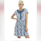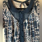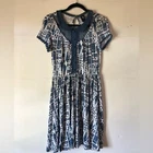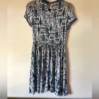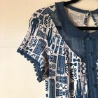 Dr.Who fan’s will have fun with this dress! The Dr. Who novelty print knit fabric, lace insert, key-hole button back closure, mock button up bodice, skater style, and Peter Pan collar, will make it a favorite. Shoulder to waist:17” Waist to hem:19 1/2” Sleeve length: 6” Chest across:16” Waist across:13”
