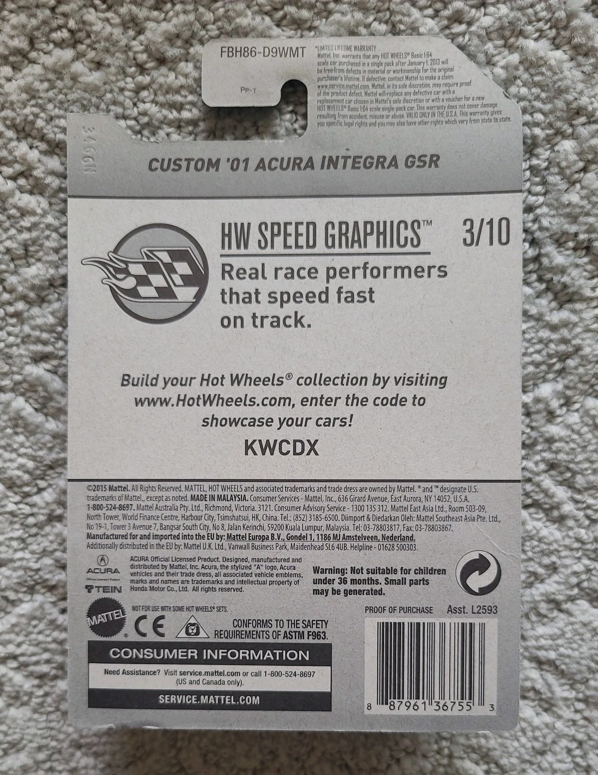 Character Family:Hot Wheels IntegraVehicle Make:AcuraGender:Boys & GirlsYear of Manufacture:2017Age Level:3-4 Years, 4-7, 8-11 Years, 12-16 Years, 17 Years & UpVehicle Year:2001Series:Hot Wheels ZamacModel:Acura Integra GSRMaterial:DiecastTheme:Hot Wheels Zamac Acura IntegraCountry/Region of Manufacture:MalaysiaFeatures:Limited Edition, Unopened Box, Advertising Specimen, Special EditionBrand:Hot WheelsColor:SilverVehicle Type:CarScale:1:64Customized:NoAutographed:NoRecommended Age Range:3 +