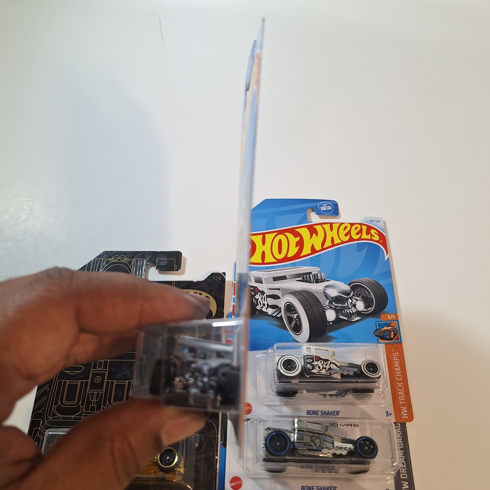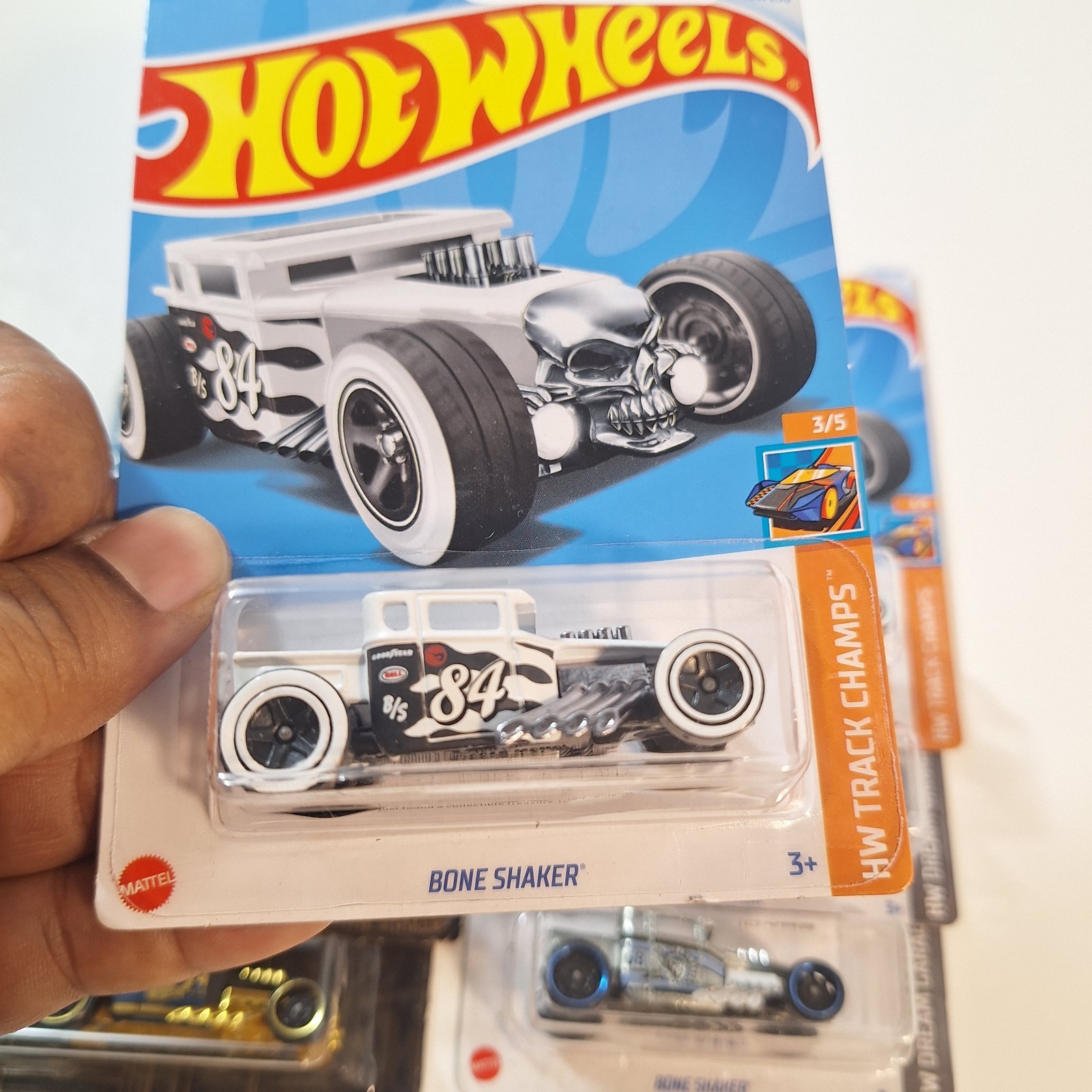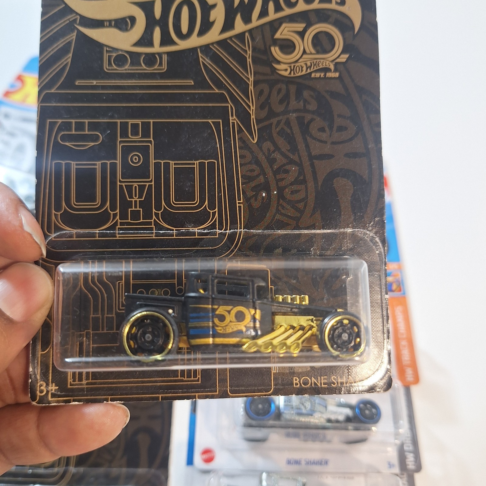 The Hot Wheels Bone Shaker is a special edition car from the Hot Wheels Treasure Hunt series, celebrating its 50th anniversary. This diecast toy vehicle is part of the contemporary manufacture line and is sure to be a sought-after collectible for car enthusiasts and collectors alike. The Treasure Hunt and Zamac cards that come with it add to the excitement and collectibility of this unique Hot Wheels model.