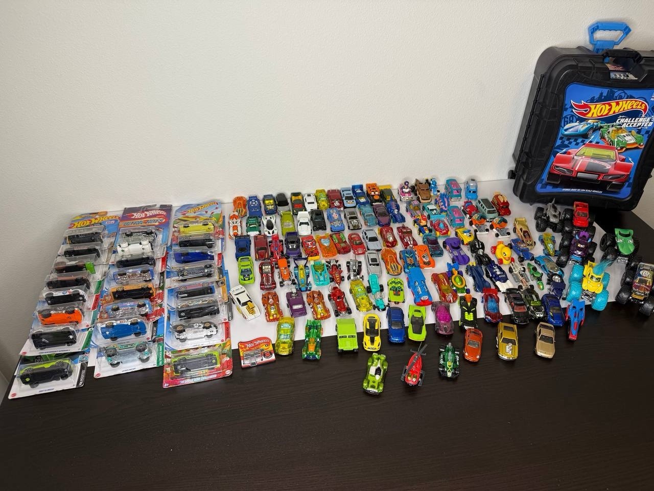 Condition: Gently used / some new in package Brand: Hot Wheels Scale: 1:64 Huge Hot Wheels collection — more than 100 cars, including classic castings, fantasy models, Monster Trucks, and special editions. Most cars are in very good condition, a few are still new in the original packaging. Includes one large Hot Wheels Challenge Accepted carrying case (fits 110 cars). Perfect for collectors or kids who love cars!