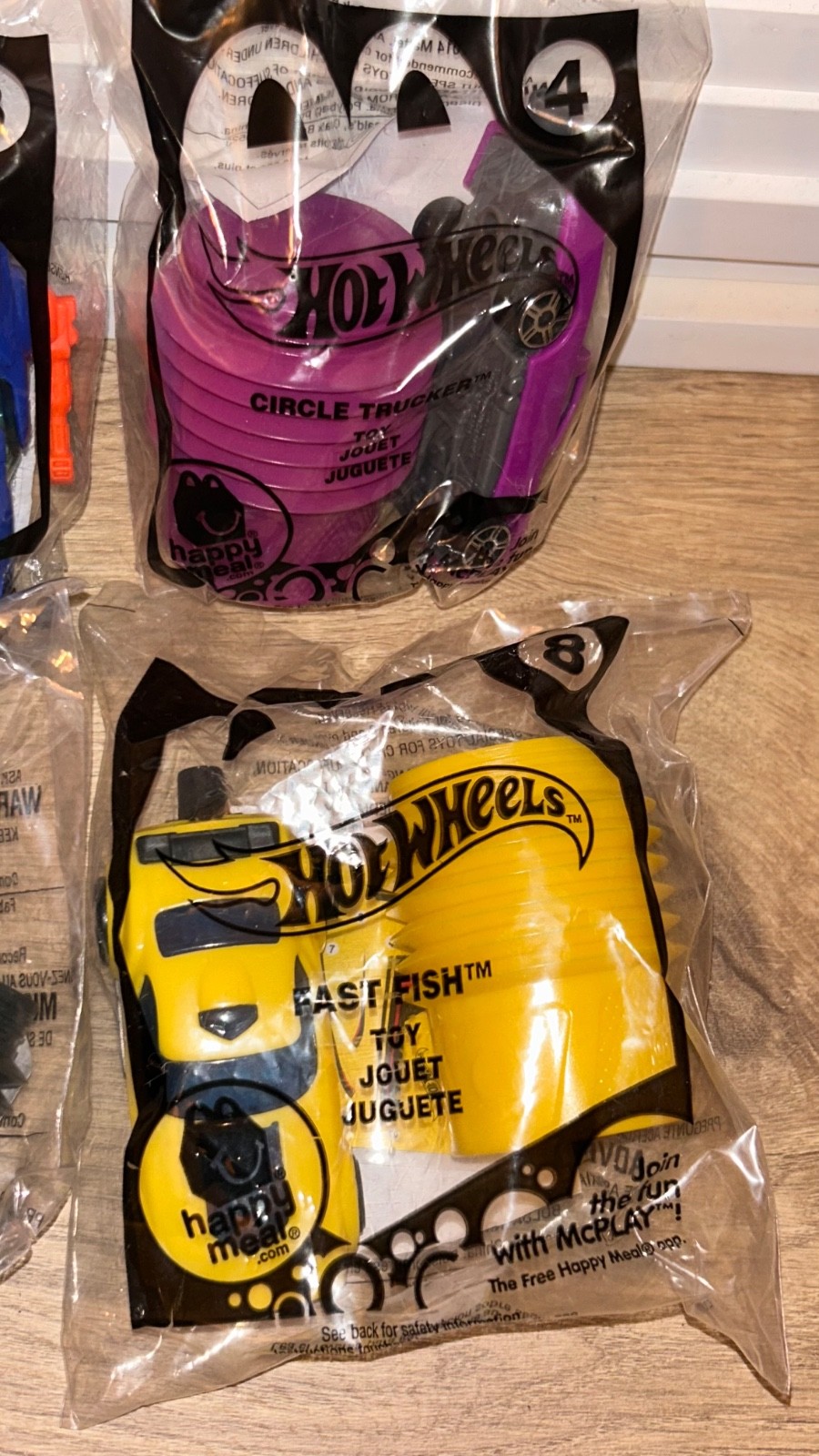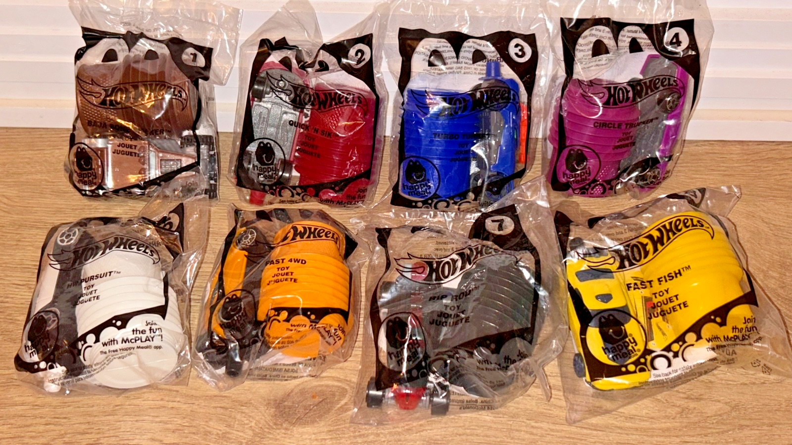 Hot Wheels McDonald's Happy Meal Toys Complete Set of 8 Cars 2004 New Sealed Includes full set of 2004 Hot Wheels Happy Meal Cars. Aslo includes Guardians of the Galaxy Backpack from Subway. All are in excellent, new condition.