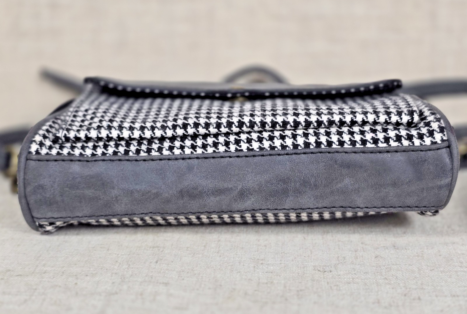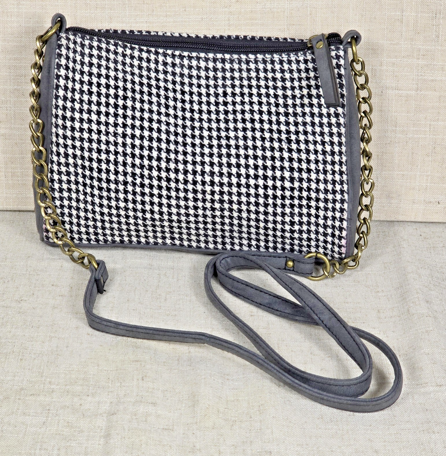 Houndstooth and Gray Faux Leather Shoulder Bag With Studded Accents Classic black and white houndstooth pattern with gray faux leather accents, studded sides, and a chain strap with faux leather This is very stylish Made for every occasion