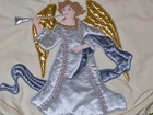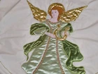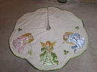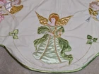 House Of Hatten 3 Angels Holding Musical Instruments Christmas Tree Skirt Mettalic gold wings 3 angels holding 3 different musical instruments Angels are wearing pink, green and blue dresses 57 1/2" diameter No box, but in mint condition