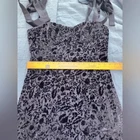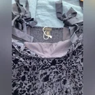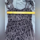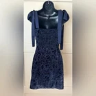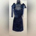 This House of Harlow 1960 dress is a Navy Blue velvet mini dress with floral accents. It features a sweetheart neckline, sleeveless strappy sleeves, and a corset design. The dress has a zipper closure and a bow accent. Made of nylon and viscose, it is suitable for weddings, parties, or formal occasions during the summer, fall, or spring seasons. Size M. lined with floral print velvet design Satin bows on shoulder Dress has a side zipper closure Elastic across the back