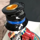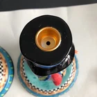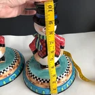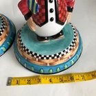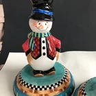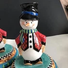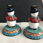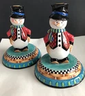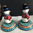 House of Hatten Christmas Snowman Large Candle Holders Set of Two One snowman has a chip on his hat shown in photos and colored in black. Other than that...no chips, cracks or stains. Measurements are in photos.