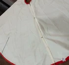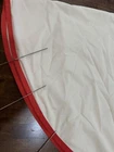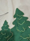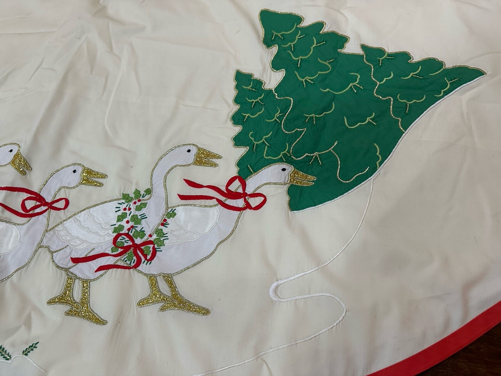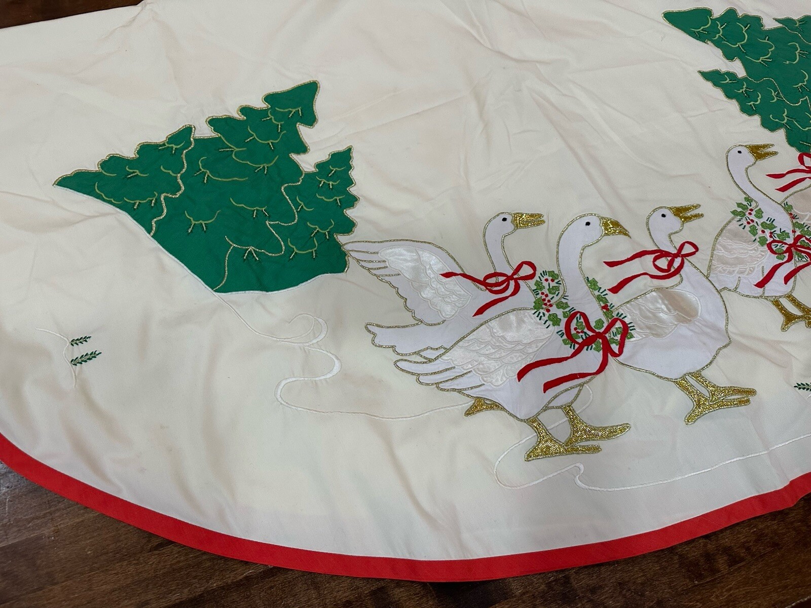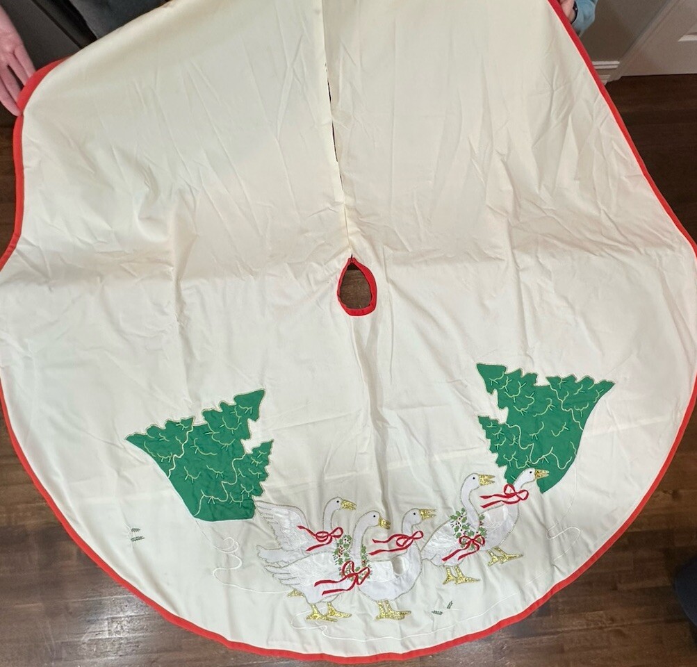 Beautiful vintage tree skirt in good preowned condition. There are small marks throughout the skirt - I’ve tried to show in photos. All are fairly light and not that noticeable. I have not tried cleaning/treating them. There is also some loose stitching around the trim at the center of the skirt. Overall it still looks good and the design is so charming and classic. Beautiful quality.