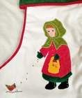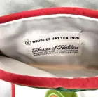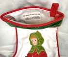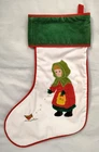 16" x 10" and across top opening is 6". Velvet brushed feel on top green, on outer rib, and on figure. Little Victorian girl holding basket feeding bird. Applique figure. Stitched very fine details throughout. Stocking is in very nice shape for its age. Has a few faint spots and scratched velvet on green top see pics. Made for House of Hatten 1976 in the Philippines. Manufactures tag inside. This is a non smoking environment.