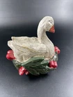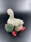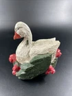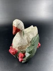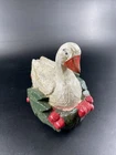 Vintage House of Hatten Goose on nest hanging ornament. This "Geese a Laying" design is by Denise Calla for the 1989 Twelve Days of Christmas collection. Folk art style. Each is hand painted making each unique and one-of-a-kind. The ornaments measures approximately: 4 inches tall x 4 inches long x 3 inches wide.