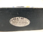 House of Hatten Santa on Train Christmas Tree Ornament. Very good - good, see photo #5, name marked on bottom label. Measures approx. 5" x 5.5". Gold metallic thread hanger.