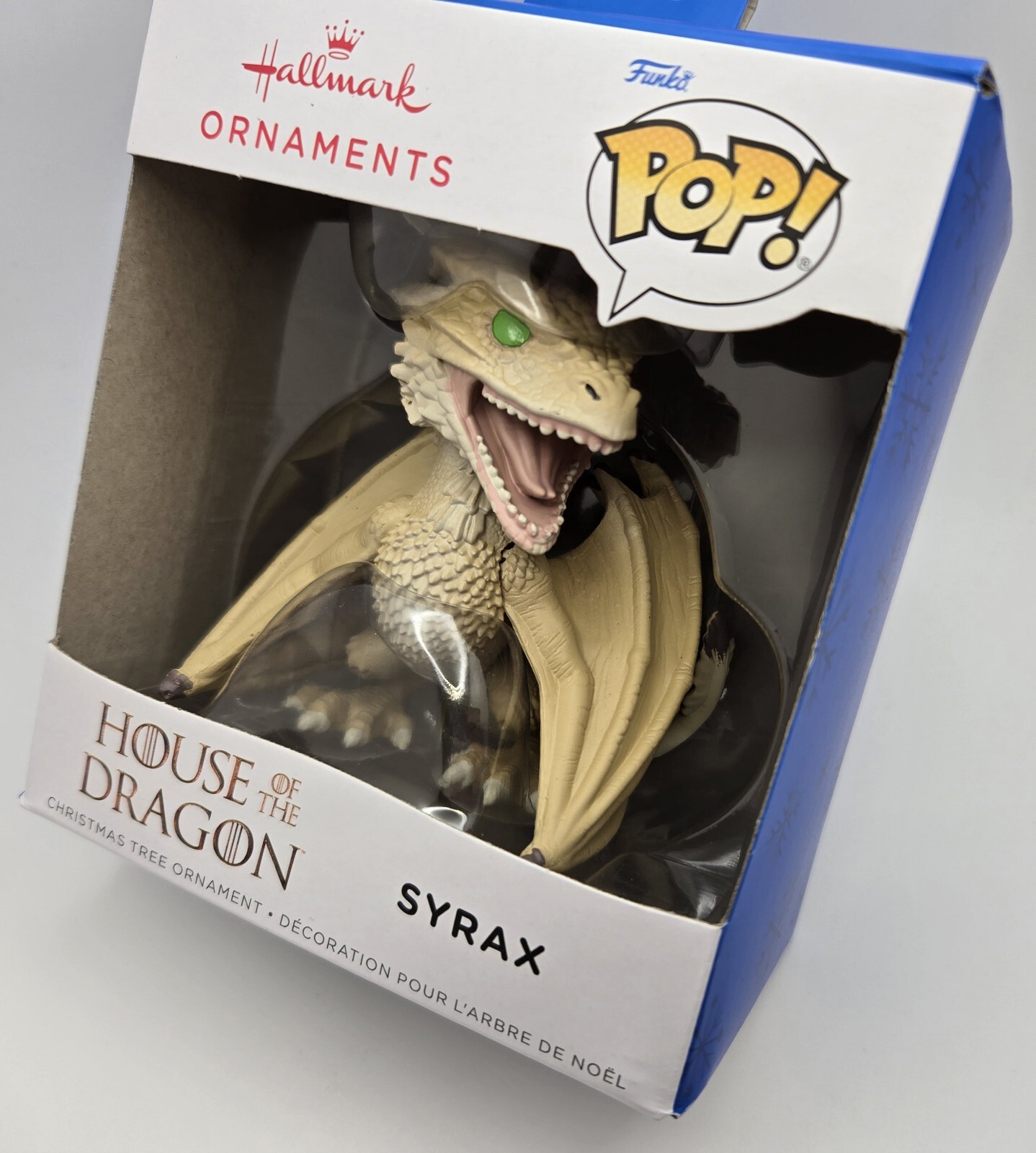 *Free shipping with USPS Ground Advantage. Ships ASAP. Packaged with care. Smoke-free home.* The Hallmark ornament features Syrax from Game of Thrones spin-off House Of The Dragon in a small, beige design. This 3-inch collectible ornament is part of the Funko POP! collection and is themed around film & TV. It is a 2024 release with hanging and boxed features, perfect for Christmas decorating.