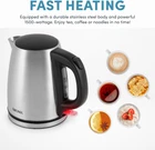 Easy-to-use, one touch operation Quickly boils water at a cup-a-minute speed Beautiful and durable stainless steel finish Cordless pouring for easy serving Automatically switches off when water reaches boiling point Experience the best way to boil with the AROMA 1L/4-cup Electric Kettle! Soothing tea. Hearty oatmeal. Nourishing noodles. Digital controls for water heated to your desired temperature. Water boils at a blazing, cup-a-minute speed. Once the desired temperature is reached, the kettle automatically shuts offso there is no more hovering over the stove or worrying about a forgotten pot boiling over. Easily serve and share favorite beverages with convenient cordless pouring. And the stylish stainless steel finish always looks great, whether serving or simply sitting on the counter.