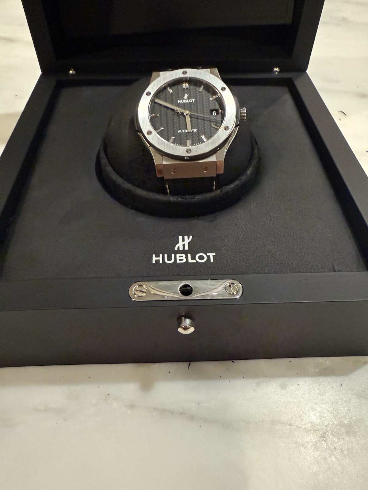 Up for sale is an authentic Hublot Classic Fusion Titanium 45mm men’s watch, model 511.NX.1771.GR.PL.P15. This timepiece features a lightweight titanium case, carbon fiber dial, and a clean, modern look true to Hublot’s iconic design. Comes complete with the original Hublot box and authenticity card. New With Box & Papers Fast shipping