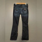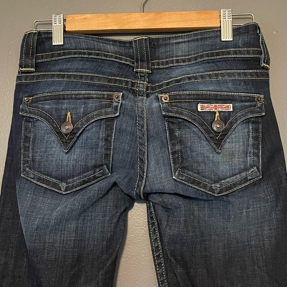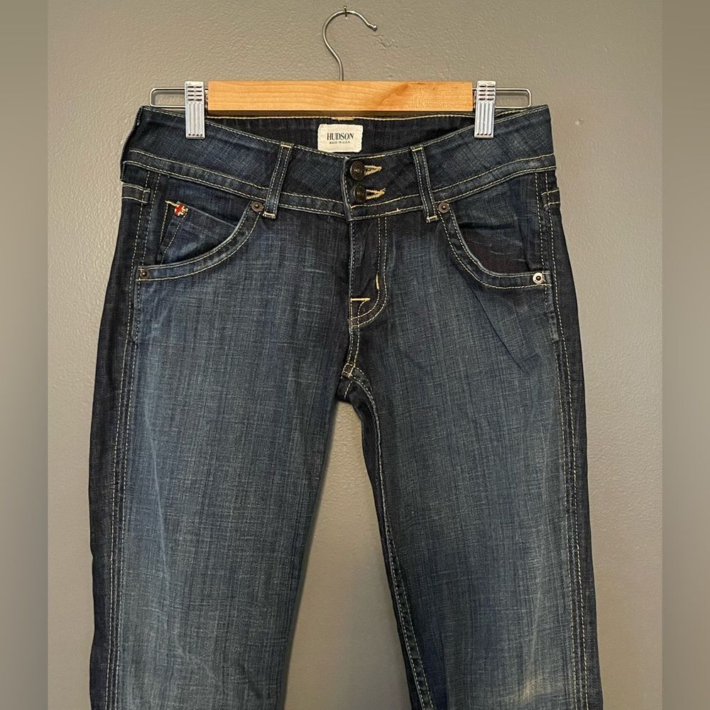 Classic Hudson bootcut jeans in a rich dark indigo wash with a flattering slim fit through the leg and subtle flare at the hem. Made with premium stretch denim that hugs comfortably while holding its shape. Finished with signature flap back pockets, contrast stitching, and a mid-rise fit that's easy to style for everyday or dressed-up looks. Dark wash denim makes these versatile year-round — perfect with boots, heels, or sneakers. Condition: Very good pre-owned condition Size: 26 Measurements (laid flat, approx): Waist: 13 in Rise: approx mid-rise Inseam: 27 in Hudson jeans, bootcut denim, dark wash jeans, stretch denim, slim fit, classic jeans, capsule wardrobe, everyday denim