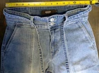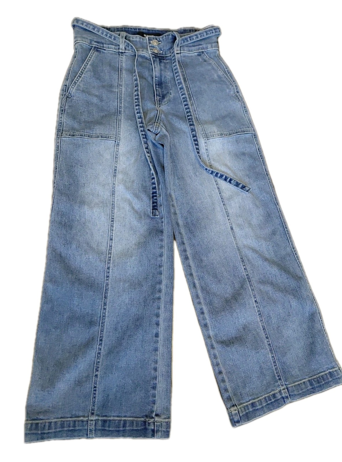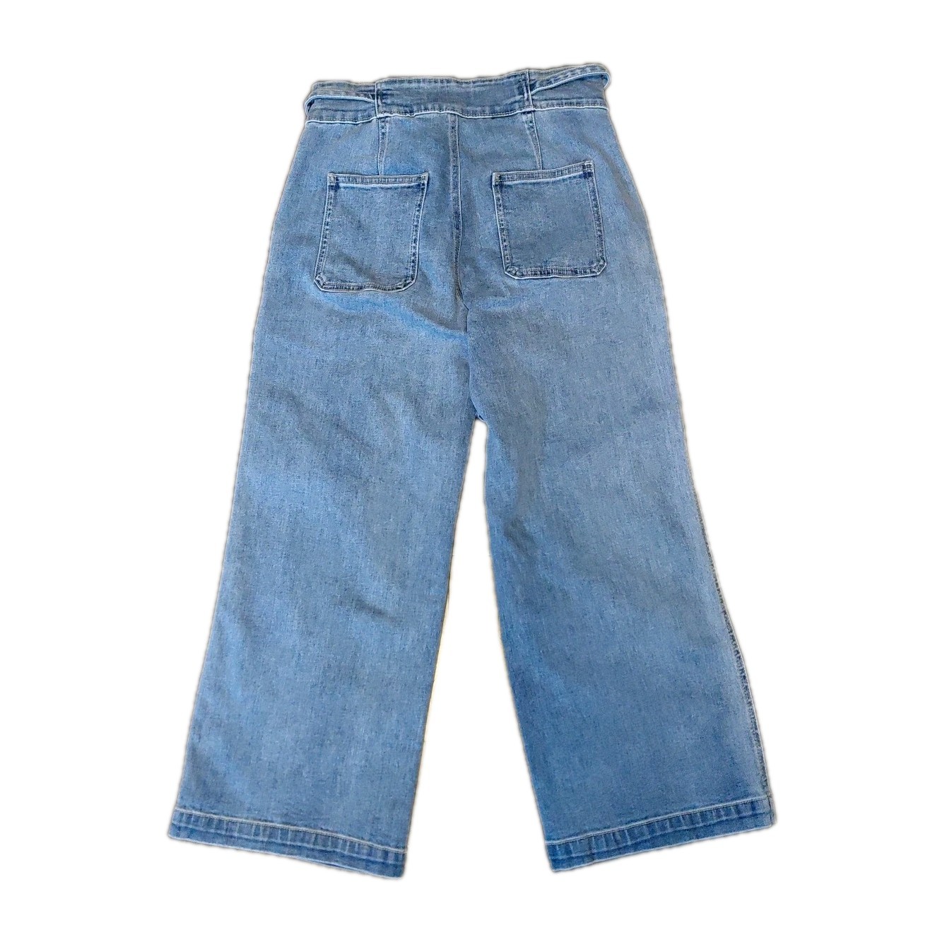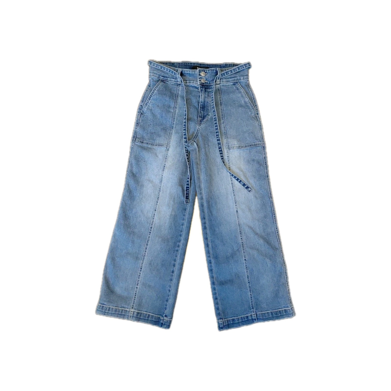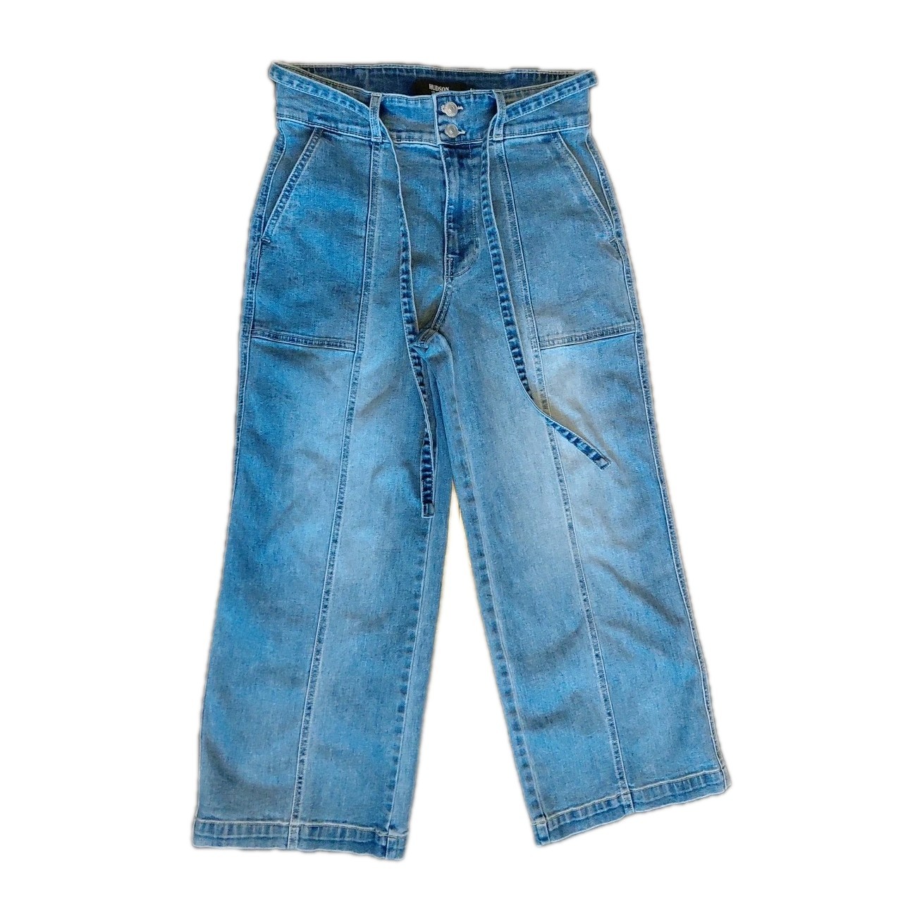 The Hudson High Rise Belted Wide Leg Cropped Jeans in women's size 6/28 are a stylish and comfortable addition to any wardrobe. Made from a blend of polyester, spandex, and cotton, these jeans feature a solid blue color with a light fabric wash. The high rise waist and relaxed fit offer both comfort and style, while the wide-leg design adds a trendy touch. Complete with a zip, tie, and button closure, these machine washable jeans are perfect for any season and can be dressed up or down for a variety of occasions.