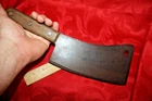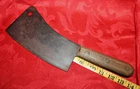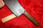 Nice old big heavy meat cleaver that is marked in center of blade VILLAGE BLACKSMITH WATERTOWN WIS in all capital letters. Its hard to read because the surface is a little rough and probably needs restoration to see clearly. No big issues. Handle is in good shape too. It measures a bit under 14" overall and the blade is apx 8" in length. See all pictures and my other listings. The last photo shows a couple of tiny dings along the very top edge. No big deal but they will be there when it arrives at your house should you buy it now for 65$ with 6$ well packaged shipping. Thank you and Good Luck! Rick
