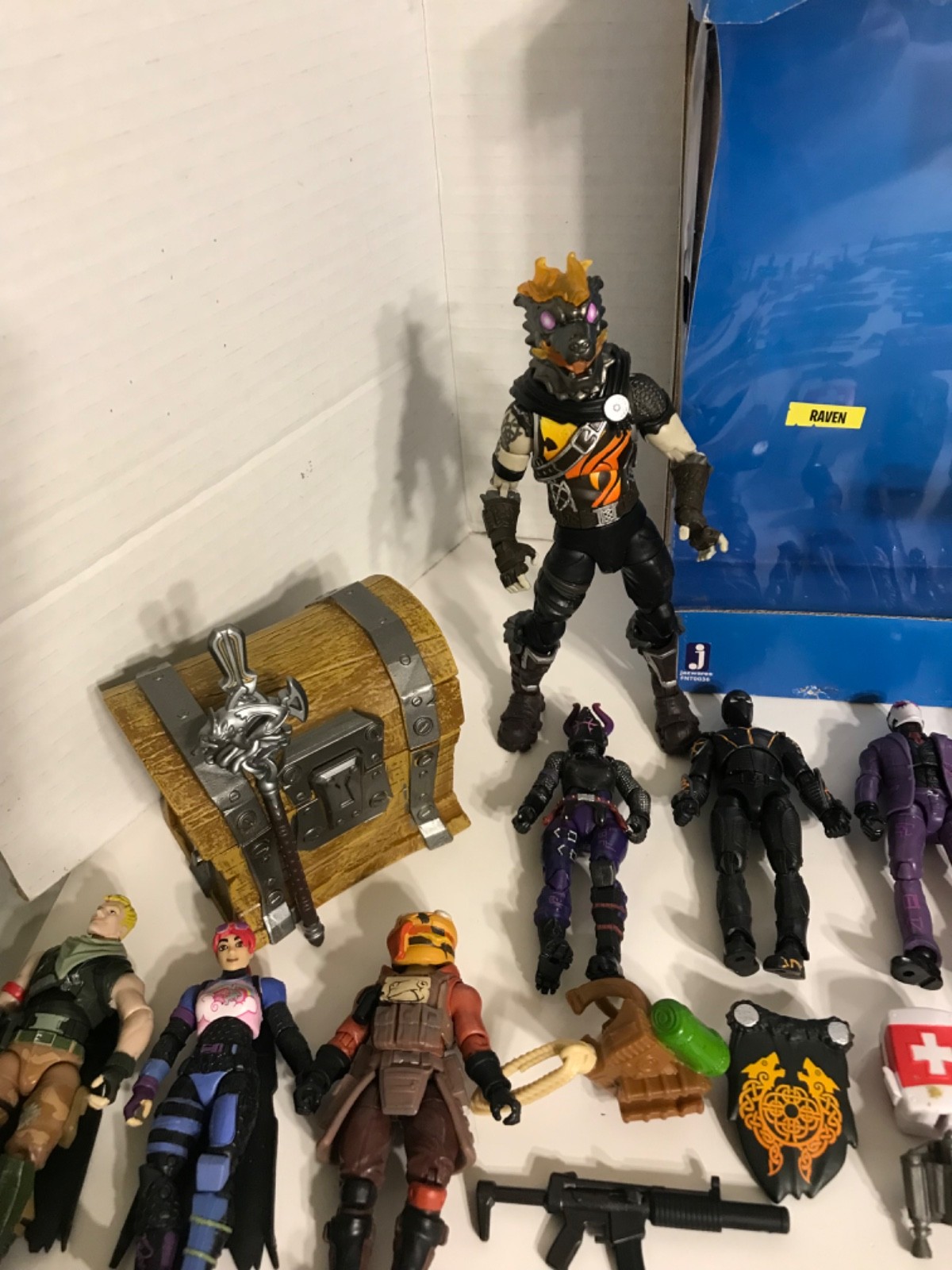 Huge Jazwares Fortnite Turbo Builder Set Chest Figures Weapons Accessories Lot 2018’ Jazwares Epic Games Turbo Builder Set Ages 8+ 94 Pieces Included 5 Extra Building Materials Sheets Included 27 Metal Building Materials, 27 Brick Building Materials 31 Wood Building Materials Comes With Jonesy Action Figure No Raven Action Figure Included Had Brite Bomber Action Figure Instead Comes With 4 Weapons And 2 Harvesting Tools Great Gently Used Condition Missing Raven Action Figures Comes With Brite Bomber Instead. Comes With Fortnite Skins, Weapons, And Accessories Brochure. Also Included In The Lot Are 14 Extra Fortnite Action Figures, 2 Giant Fortnite Action Figures, Extra Head For One Of The Giant Fortnite Action Figures, Giant Treasure Chest, 26 Harvesting Tools, Crossbow, 68 Guns, Sword, Knife, 9 Backpacks First Aid Kit, 9 Accessories Great Gently Used Clean Condition, The Turbo Builder Set Comes With 4 Extra Building Material Pieces So A Total Of 85, Comes With Jonesy Although Raven Is Missing From The Box. Also Included Is 15 Action Figures, 2 Giant Action Figures, Large Treasure Chest, First Aid Kit, Over 70 Guns, 1 Rocket Launcher, Over 25 Harvesting Tools , 9 Backpacks, Sword, Knife, And 9 Accessories, And A Fortnite Skin & Weapons Advertisement. Original Box Is Damaged Please If You Have Any Questions About This Huge Jazwares Fortnite Turbo Builder Set Chest Figures Weapons Accessories Lot Feel Free To Contact.