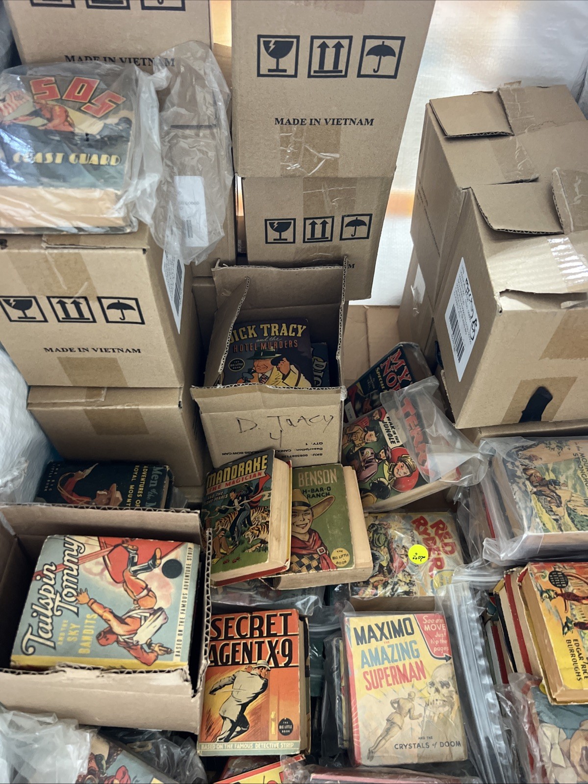 Collection 165 BOOKS. Each book is packed in a separate package. For sale is a huge lot of vintage Big Little Books and other pulp-style books, featuring classic characters and stories from the Golden Age of comics and literature. Titles include (examples): – Dick Tracy and the Hotel Murders – Tailspin Tommy and the Sky Bandits – Secret Agent X-9 – Maximo the Amazing Superman (Crystals of Doom) – Red Ryder – John Carter of Mars (Edgar Rice Burroughs) – Once Upon a Time – Terry and the Pirates – Charlie McCarthy Most books are original vintage editions, some may have wear consistent with age (see photos for condition). Approximate Quantity: Several hundred books (full large box). Great for collectors, resellers, or vintage decor enthusiasts! Sold as-is, as a bulk lot. No returns. Please review all photos before bidding. Vintage Big Little Books, Pulp Comics, Dick Tracy, Red Ryder, Tailspin Tommy, Secret Agent X-9, Maximo Superman, John Carter of Mars, Golden Age Comics, Vintage Comic Lot, Old Comic Books