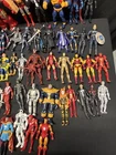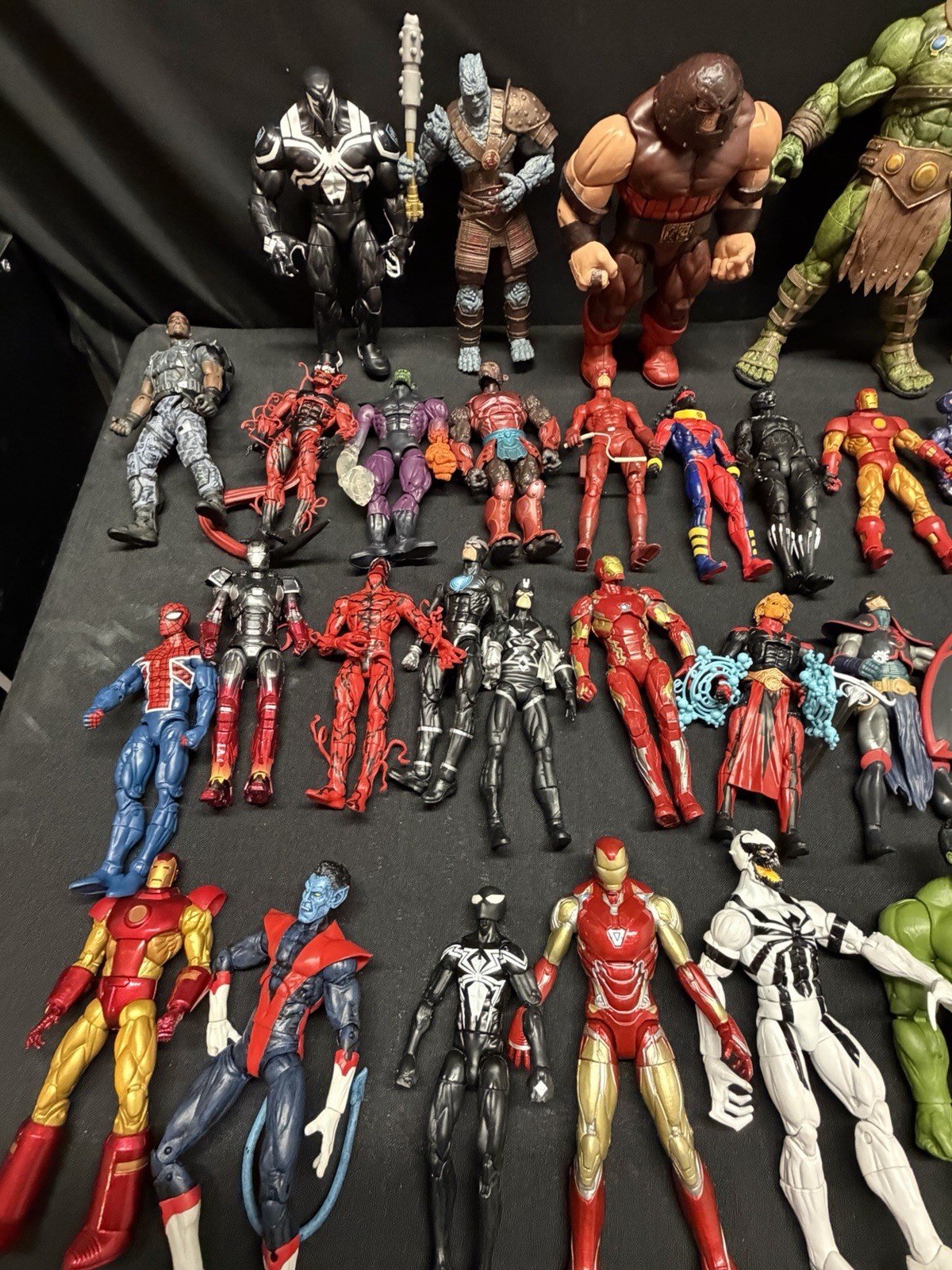 This product is a huge lot of 116 Marvel Legends action figures featuring characters like Iron Man, X-Men, and Ghost Rider. The figures are made of plastic and stand at a 6-inch height, with a 1:12 scale. The lot includes various characters from the Marvel franchise, many in red color schemes, and some representing ships. They are from the Disney animation studio and are original licensed reproduction items. These action figures would be a great addition to any Marvel fan's collection. There is 116 total figures with some marvel selects sprinkled in. Some of these figures come with accessories as pictured while most do not. Please see pics.