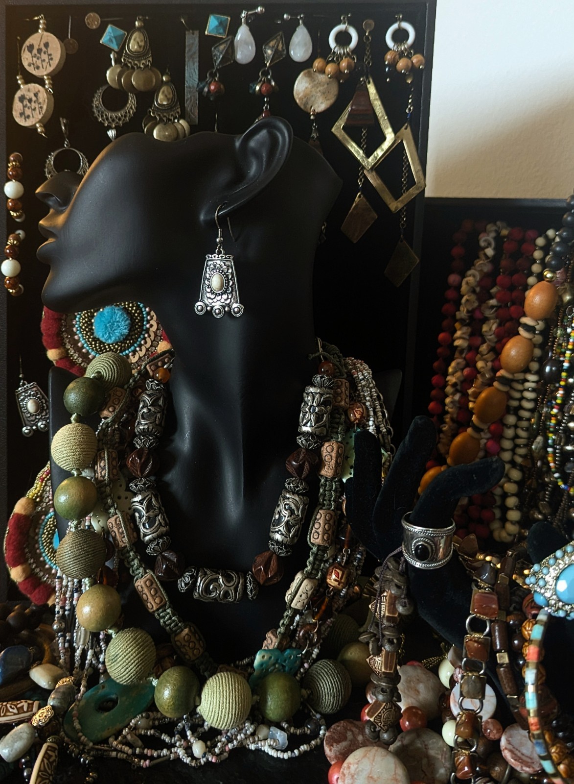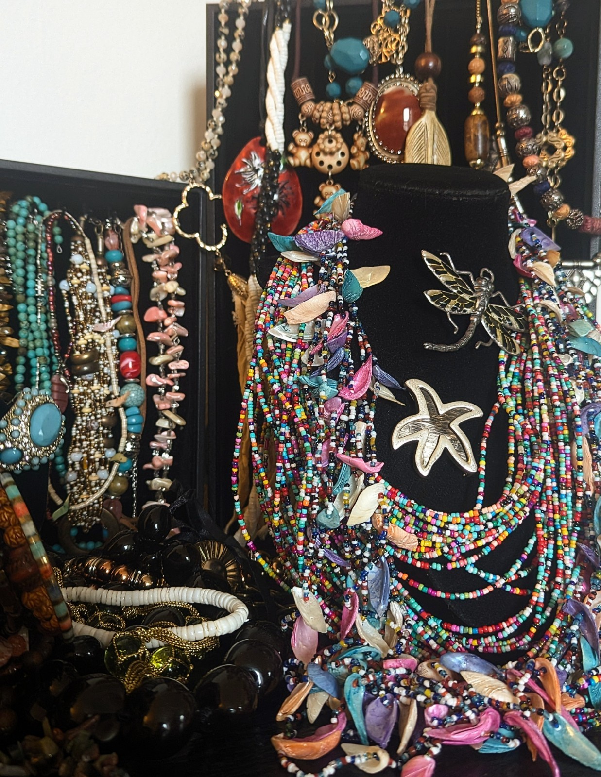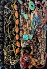 84 pieces of vintage artisan & southwestern boho jewelry: NECKLACES: 37 -4 pendants, non-adjustable -3 barel screw clasps -8 lobster clasps, adjustable -5 lobster clasp, non-adjustable -2 spring ring clasps, non-adjustable -6 continuous/rope necklaces (no clasp) -3 hook clasps, non-adjustable -1 adjustable hook clasp, but it's missing the hook (will need repaired) -2 ball & eye closures -3 tie on necklaces BRACELETS: 24 -15 stretch -4 bangles -2 adjustable *one of which may need restrung or repurposed -3 clasps *two measuring at 7" open, and the other at 9" EARRINGS: 18 -hooks, 11 *one pair is missing a hook and will need repaired -screw back, 1 -clip on, 2 -push back post, 3 -wire hoop, 1 RINGS: 2 -blue adjustable, size 7+ -silver is size 7 BELT: 1 adjustable *from hook to first loop, approx. 23" *hook to last loop, approx. 37" Brooches: 2 -dragonfly, 3" x 2.5" -starfish, 2" x 2" Feel free to message me with any questions! *jewelry will need cleaned prior to wearing *all items sold as is *set and display materials not included