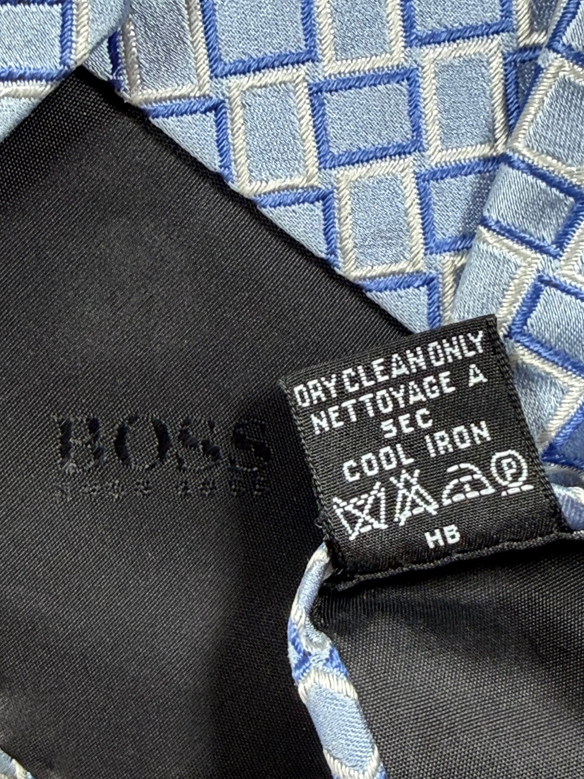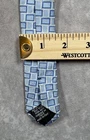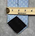 Hugo Boss men’s silk tie featuring a light blue geometric pattern. Made in Italy from 100% silk with a smooth woven finish. Measures approximately 3.25 inches at the widest point. 59 inches long. Good pre-owned condition overall. There is noticeable discoloration on the underside tip, which does not affect the front appearance when worn. Please review photos for detail. A solid option for office wear, formal events, or adding to a designer tie rotation.