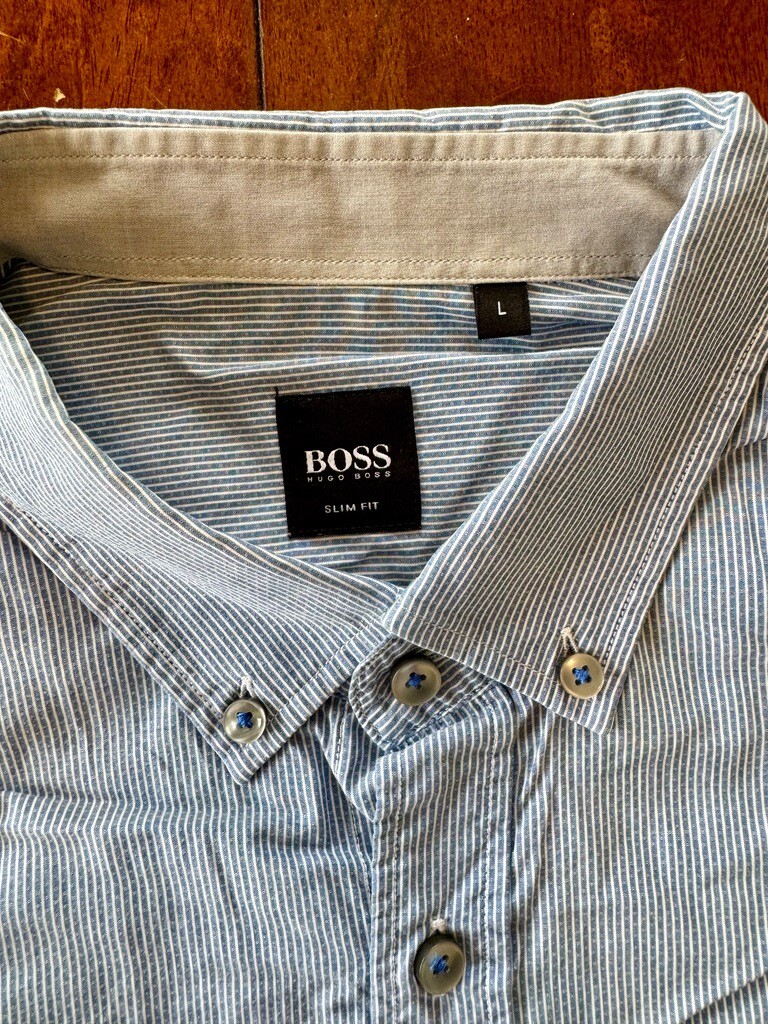 Introducing this stylish Hugo Boss men's long-sleeved button down shirt, meticulously crafted from 100% cotton fabric in a refreshing blue hue with fine white stripes. Designed with a slim fit silhouette, this shirt offers a clean profile that effortlessly combines style with comfort, making it perfect for both formal and informal occasions. Features: Brand: Hugo Boss Fabric: 100% Cotton Color: Light Blue with fine white stripes Size: Large Condition: Great Condition. Please refer to the provided pictures for more details on the condition of the item. Fit: Slim Fit Collar: Button Down Collar Sleeve: Long Sleeve Shipping: Ships only to the USA. For international shipping inquiries, please contact us. Returns: Please note that returns are not accepted. Original Price: $158.00 USD Check Out Our Other Items! Be sure to explore our eBay store for more high-quality clothing and accessories to elevate your style. Please Note: Colors may vary slightly due to lighting and monitor settings. Feel free to contact us with any questions or for additional photos. Thank you for considering this Hugo Boss shirt! Elevate your wardrobe with this versatile and sophisticated piece.