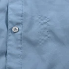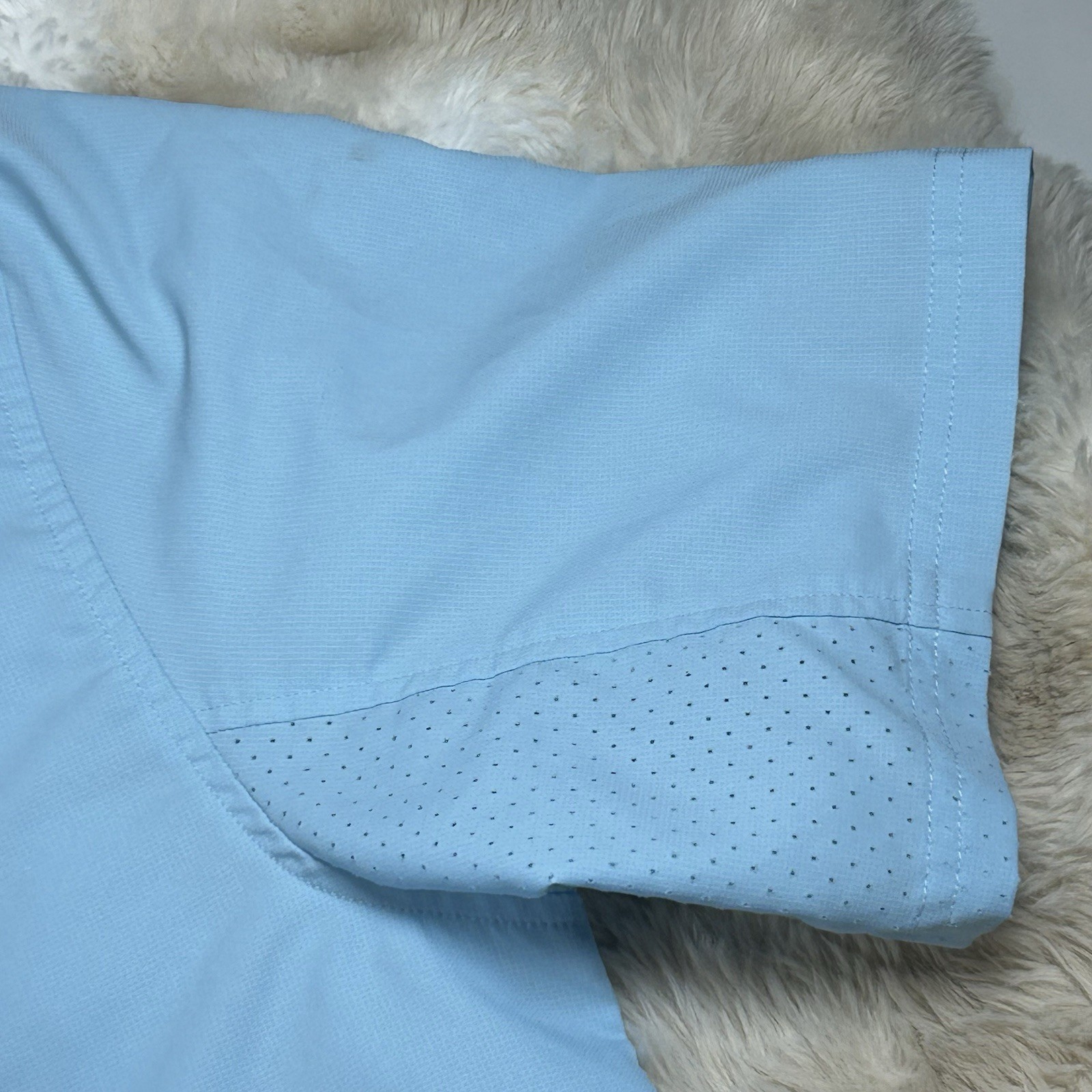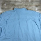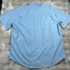 The Huk Shirt for men in size 2XL is a baby blue performance fishing shirt designed for the ocean. Made from lightweight and breathable polyester material, this short sleeve button-up shirt features a solid pattern with a collared neckline and button-down collar style. The shirt is perfect for all seasons and incorporates a fish theme, making it an ideal choice for casual wear while fishing or enjoying outdoor activities. The regular fit ensures comfort and versatility for everyday wear. Pit to pit measures 27 inches Shoulder to hem measures 33 inches Missing collar buttons Small thread snags on front left bottom of shirt Price reflects condition