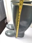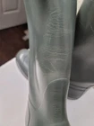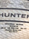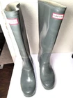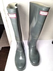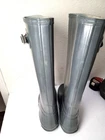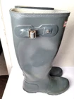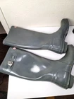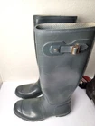 These women's rain boots are designed for durability and style. With a tall silhouette, they provide excellent protection against wet weather, keeping feet dry and comfortable. The buckle detail adds a touch of elegance, while the gray color ensures versatility in pairing with various outfits. • Tall silhouette for added coverage • Adjustable buckle detail • Non-slip rubber sole • Iconic Hunter branded logo • Comfortable fit CONDITIONS pre owned, Slight scuffs, minor stains inside, good conditions. see photos for flaws details and measurements.