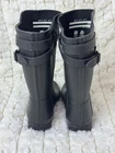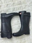 The Hunter Wellington Original Grey Short Gloss Rain Boots in Black are a stylish and practical choice for women in size 7. These mid-calf boots feature a round toe shape, pull-on closure, and a low block heel for comfort and stability. With a waterproof rubber outsole, these boots are perfect for various occasions such as travel, casual outings, parties, and even workwear. The sleek grey color and shiny gloss finish add a touch of sophistication to any outfit, making them a versatile and fashionable addition to your shoe collection boots in good condition.