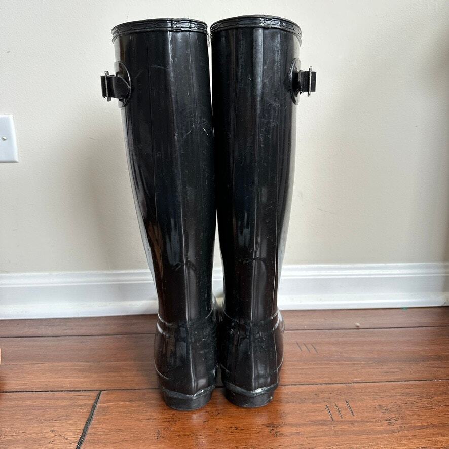 Hunter Original Tall Gloss Unisex Rain Boots, Black. Size: Men’s US 5, Women’s US 6 Boots are used and in great condition. Some surface dirt. Please see all the pictures in the listing for condition and signs of wear. gorpcore, spring, summer, gardening, preppy, travel, vacation, vacationcore, classic, casual