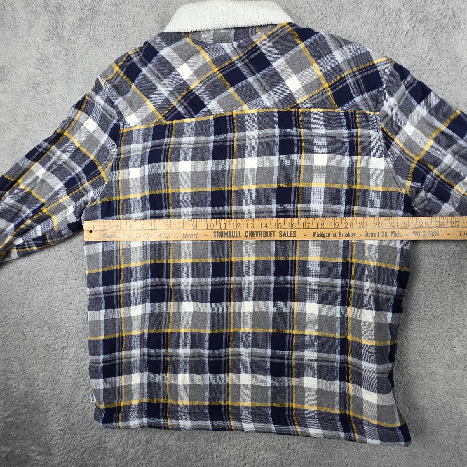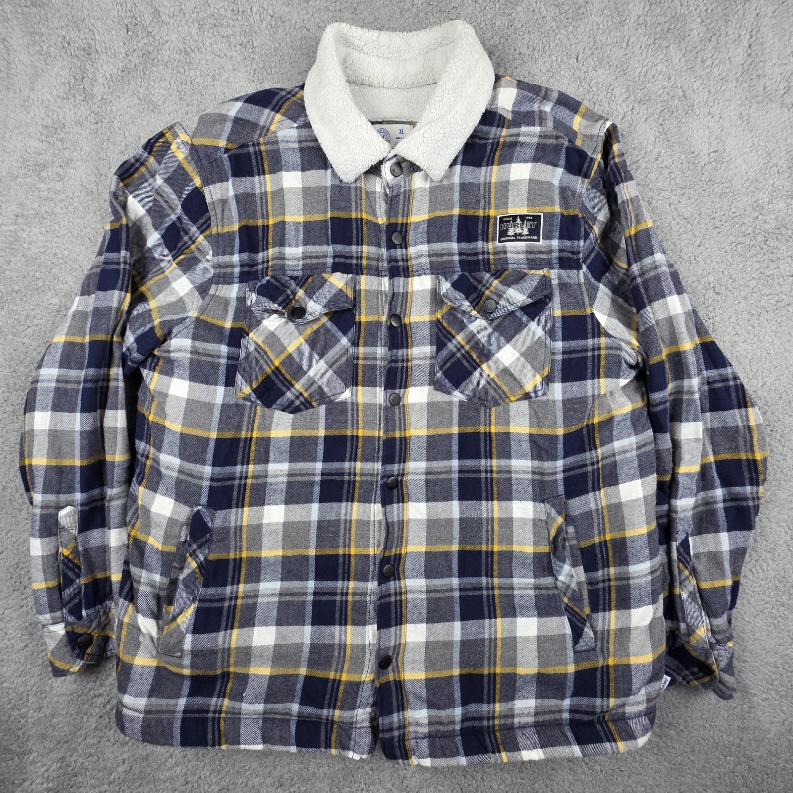 Hurley Jacket/Shacket Mens XL, Pit to Pit 24", Shoulder to Hem 28" Plaid, Snap Up, Sherpa Lined With Flap Patch Pockets Very Good Condition