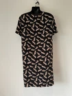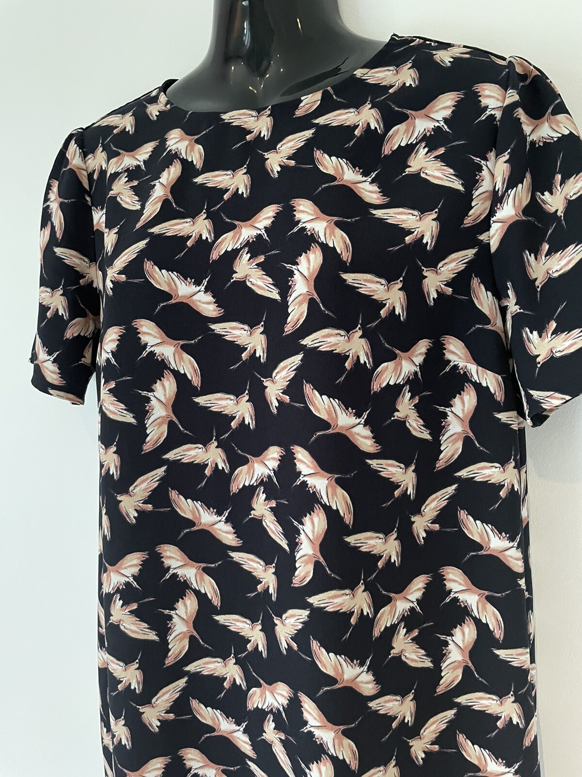HUSH BLACK SHORT SLEEVE SHIFT DRESS WITH PEACH BIRD PRINT SINGLE BACK BUTTON SIZE 12 CHEST MEASURES 20" PIT TO PIT + 36.75" LENGTH MACHINE WASH