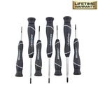 The screwdrivers in this Husky seven-piece set are equipped with contoured handles to provide a comfortable, secure grip. One Torx, three slotted and three Phillips screwdrivers comprise this assorted pack, which is particularly handy for fastening screws on electronics gadgets and trinkets in addition to other tasks involving small objects. The end cap on each handle swivels, allowing the user to hold the tool steady with one hand while cranking with the other.