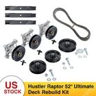 Brand New Hustler Raptor 52" Zero Turn Lawn Mower Deck Rebuild Kit Fits all Raptor 52" and Raptor Limited 52" Mowers Pre Serial # 19113534 Custom Aftermarket Kit Includes Everything in the Picture, Which Is: 3 - Blade Spindles - Replaces Hustler 604214 3 - High Lift Blades - Made in USA - Replaces Hustler 603995 3 - Blade Spindle Pulleys - Genuine Hustler - Replaces 603988 1 - Deck Drive Belt - Kevlar Corded - Replaces 791988 12 - Mounting Bolts 3 - Blade Spindle Blade Washers 3 - Blade Spindle Blade Bolts 3 - Spindle Pulley Spacers 3 - Spindle Pulley Nuts 1 - Idler Pulley - Replaces 604219 1 - Idler Pulley - Replaces 604231 1 - Idler Pulley - Genuine Hustler 605512 3 - Idler Pulley Bolts 3 - Idler Pulley Washers 3 - Idler Pulley Nuts