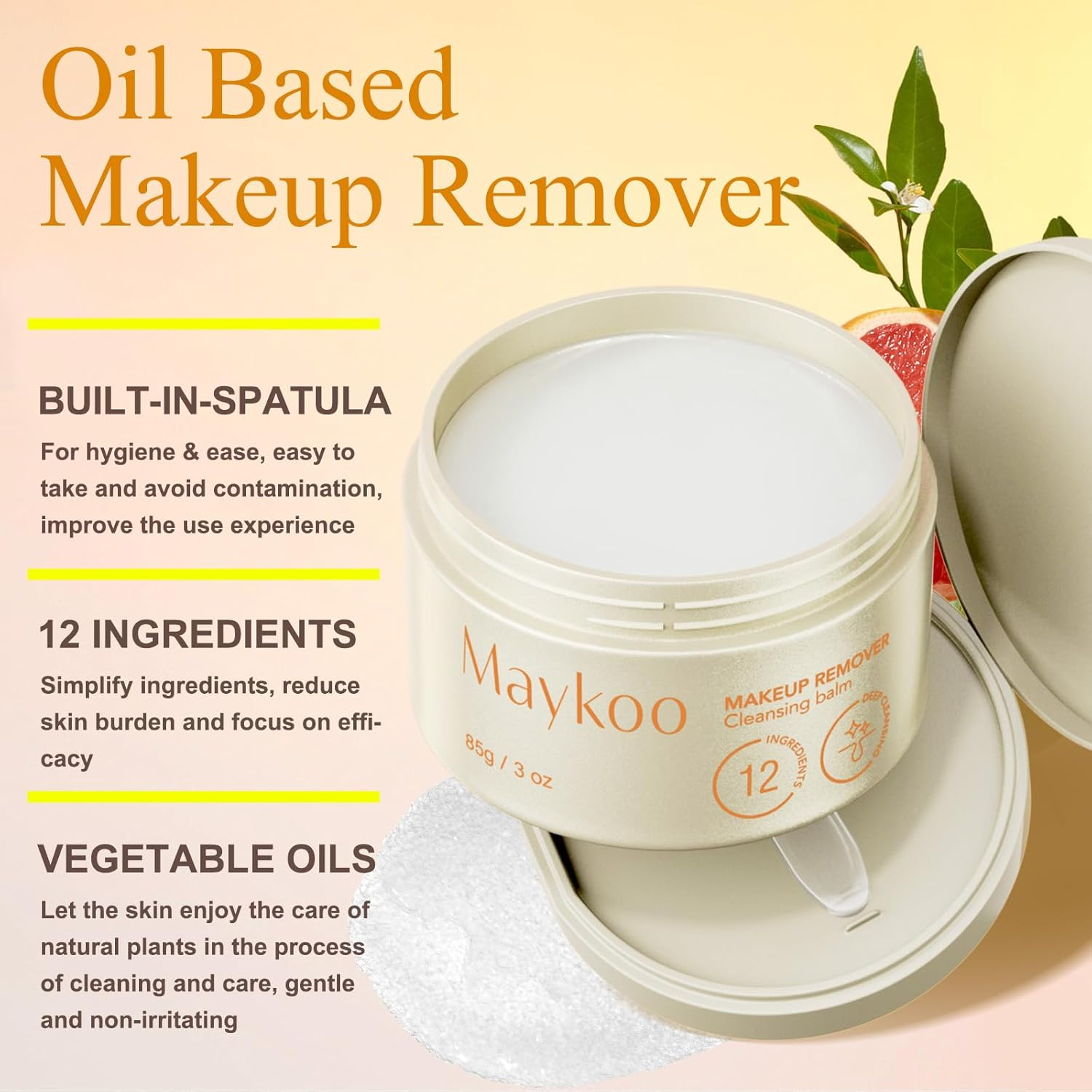 Cleansing and Hydrating 2-in-1 Cleansing Balm: MAYKOO makeup remover contains Vaccinium Myrtillus , as well as a variety of minerals and antioxidants, deeply cleansing the skin while giving it deep nourishment, bringing gentle care to the skin Quick Emulsification Technology:Melting balm makeup remover contains highly efficient oil solvent, instantly dissolves makeup, deep into pores to clean dirt, oil, residue and blackheads.Leaves skin fresh and clean, free from residual burden. Makeup eraser Oil Based Makeup Remover: Seleted ingredients *12, plant extract oil*2, simplify ingredients, reduce skin burden & focus on efficacy.Yeast - rich in amino acids, soothing skin; Grapefruit oil adjusts oil, refreshing and clean. Eco-friendly & Comfortable Mild and Non-irritating: No alcohol, no flavors, no artificial colors. Thorough oil based cleanser for face: Easily remove eyes, lips, face and sunscreen residue. Vegan and cruelty-free.This cleansing balm is suitable for all skin types Built-in Spatula for Hygiene & Ease: Scoop remover balm with spatula, gently massage into dry skin in circles,melts into oil on contact with the skin to break down makeup. Emulsify with water, massage,then rinse/wipe. Quick & effective makeup removal oil Product Description 1 Built-in Spatula 2 Moisture & Cleansing 3 Safe & Gentle